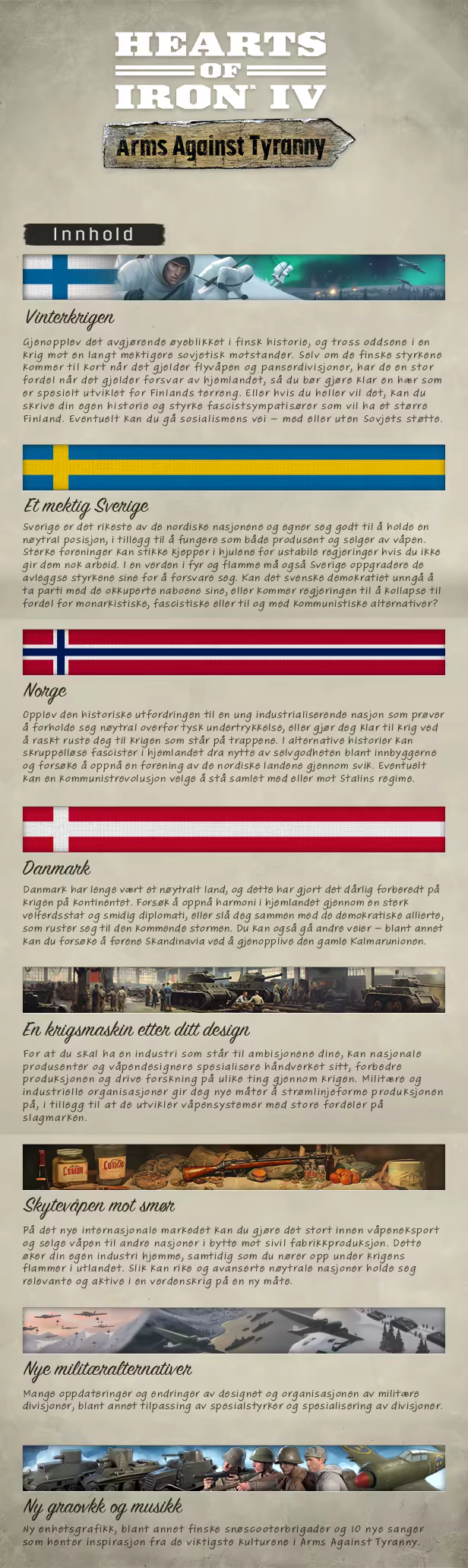 Fire nordiske demokratier later til å være hjelpeløse overfor hensynsløse diktatorer. Til tross for størrelsen har Finland, Norge, Danmark og Sverige en sjanse til å unngå å bli erobret, enten gjennom listig diplomati eller rå motstand. Skriv en ny historie for de nordiske landene i Arms Against Tyranny, en ny utvidelse for Hearts of Iron IV.