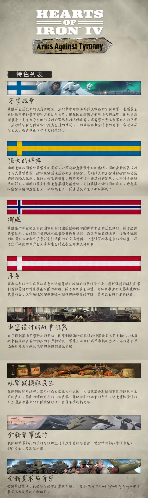 北方的四个民主国家似乎对充满掠夺性的邻近独裁国家无能为力。芬兰、挪威、丹麦和瑞典虽然小,但通过巧妙的外交或激烈的抵抗,便有机会避免被征服。在《Hearts of Iron IV》的新扩展包《Arms Against Tyranny》中,为北欧国家写下崭新历史。