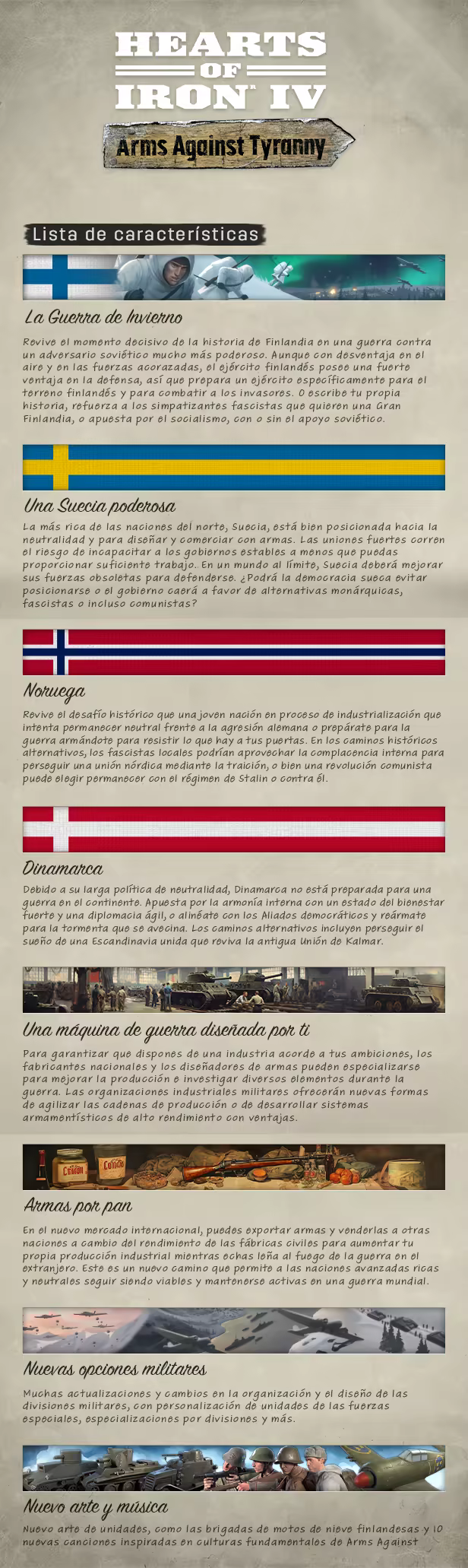Cuatro democracias del norte están aparentemente indefensas frente a las cercanas dictaduras depredadoras. A pesar de su tamaño, Finlandia, Noruega, Dinamarca y Suecia pueden evitar ser conquistadas mediante la diplomacia o la resistencia. Escribe una nueva historia de los países nórdicos en Arms Against Tyranny, una nueva expansión de Hearts of Iron IV.