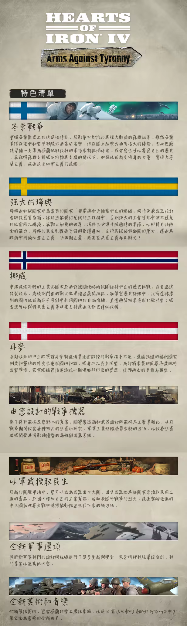 北方的四個民主國家似乎對充滿掠奪性的鄰近獨裁國家無能為力。芬蘭、挪威、丹麥和瑞典雖然小,但透過巧妙的外交或激烈的抵抗,便有機會避免被征服。在《Hearts of Iron IV》的新擴展內容《Arms Against Tyranny》中,為北歐國家寫下嶄新歷史。