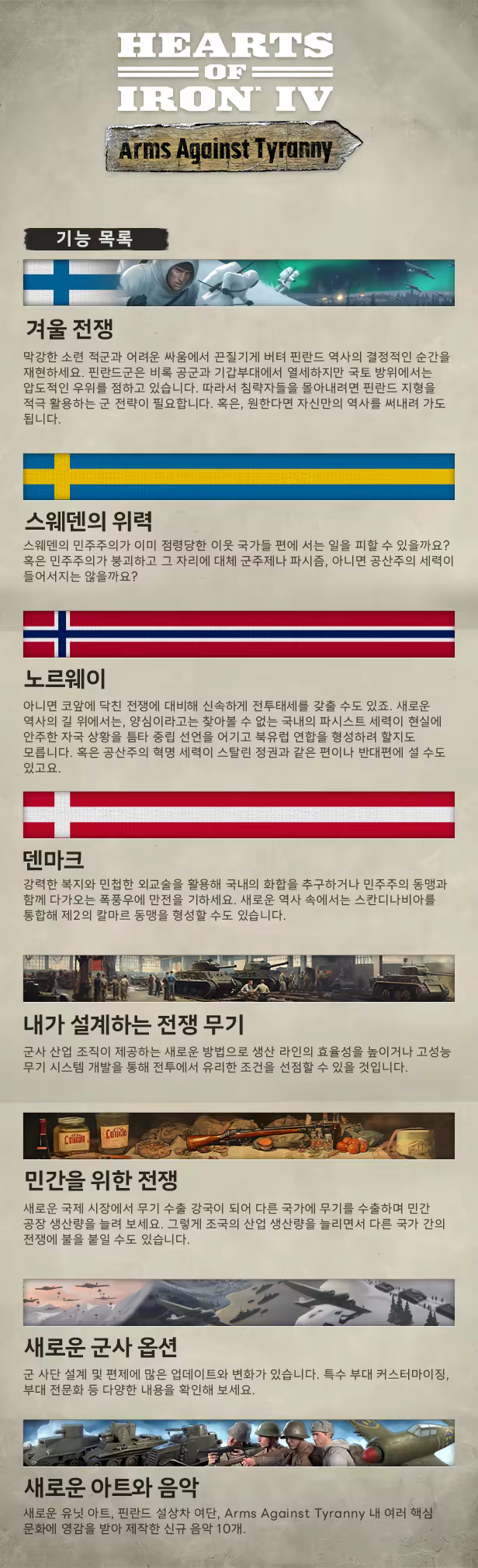 네 개의 북유럽 민주주의 국가는 인근의 악랄한 독재 정권에 속수무책인 듯 보입니다. 하지만 그 악랄함이 아무리 손길을 뻗쳐도 핀란드, 노르웨이, 덴마크, 스웨덴은 영리한 외교술과 격렬한 항전으로 독재 정권의 정복을 피할 수 있습니다. Hearts of Iron IV의 새로운 확장팩인 Arms Against Tyranny에서 북유럽 국가들의 새로운 역사를 써 내려가세요.