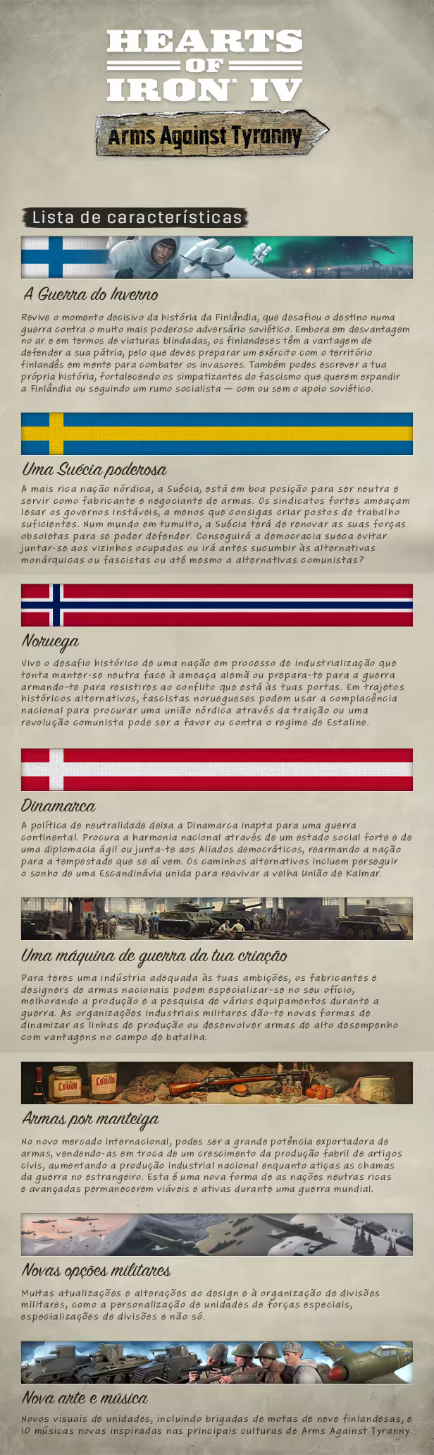 Quatro democracias nórdicas estão, ao que parece, indefesas contra ditaduras predatórias vizinhas. Não obstante o seu tamanho, a Finlândia, a Noruega, a Dinamarca e a Suécia têm uma hipótese de evitar a conquista através de diplomacia inteligente ou de resistência feroz. Escreve a nova história dos países nórdicos em Arms Against Tyranny, uma nova expansão para Hearts of Iron IV.
