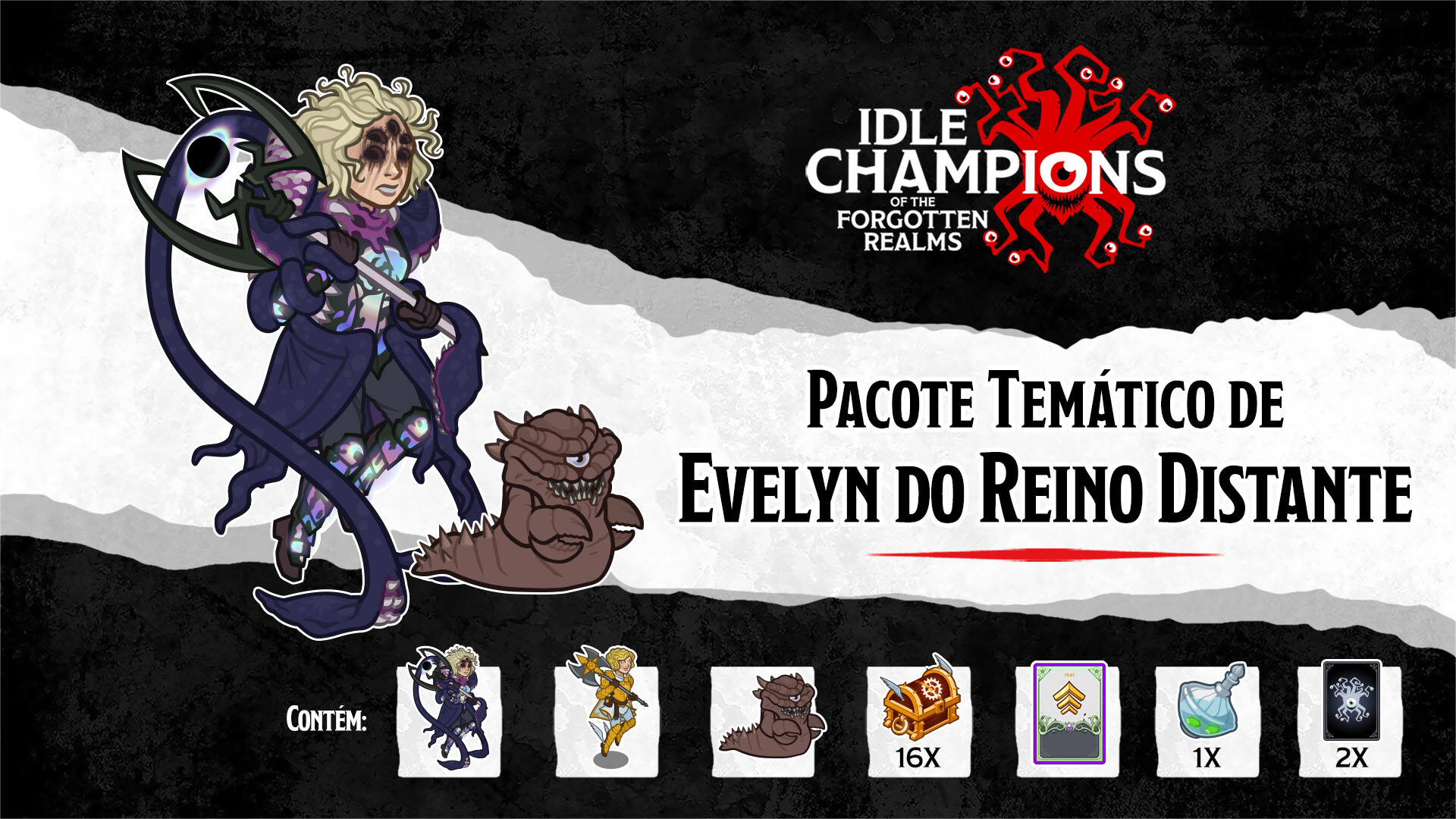 Contém 16 Baús Dourados de Evelyn com 2 Cartas de Equipamento Brilhante Garantido
