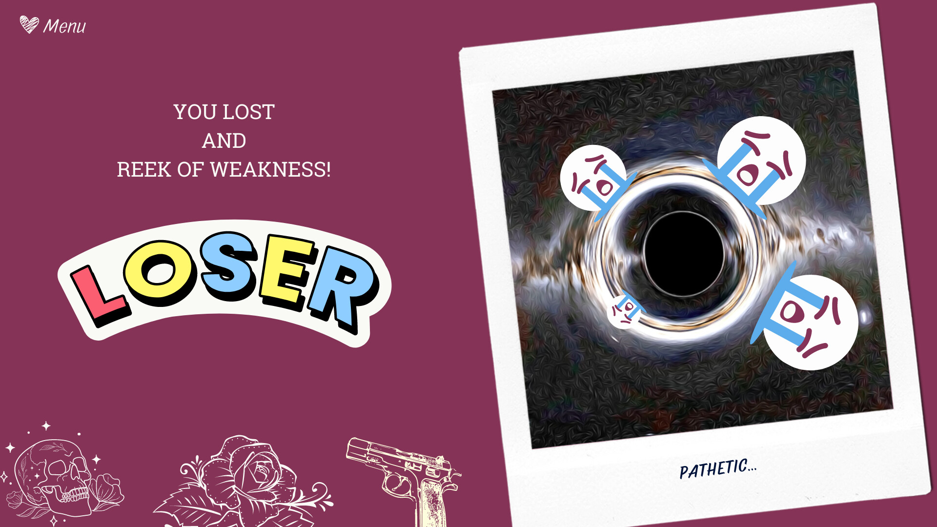 If you are a fan of Eva Morozova, Eugène Ionesco, or Daniil Kharms, this game will surely delight you, outrage you, outeat you, and outshi... Ahem. Let's not talk about that yet.