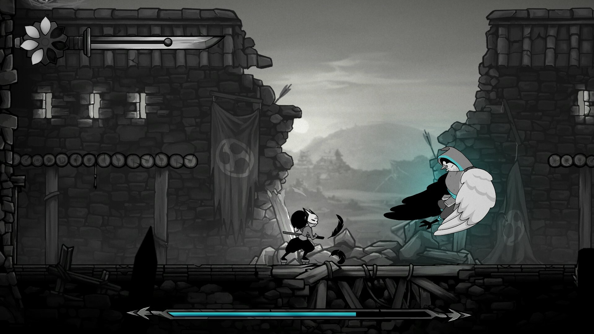 Gurei is a game about fighting strong enemies, but that’s not all. The Kami inhabit a surreal castle located between the human and spirit worlds. After each victory, Rei comes closer to the realm of spirits, starting to encounter peculiar characters from Japanese mythology. These creatures will add novelty and strangeness to your journey, providing commentary, unique animations, side objectives and obscure secrets.