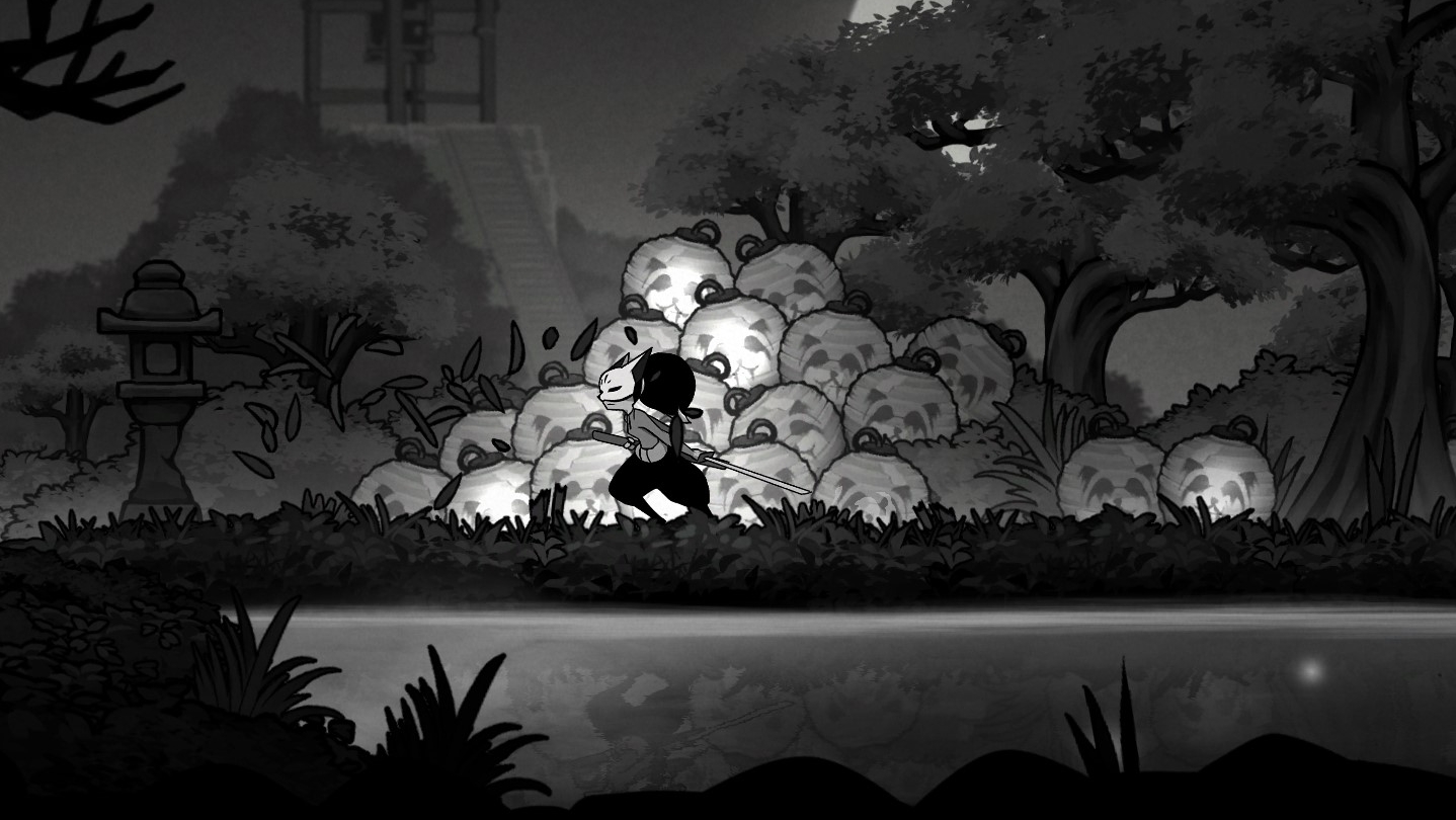 Gurei is a game about fighting strong enemies, but that’s not all. The Kami inhabit a surreal castle located between the human and spirit worlds. After each victory, Rei comes closer to the realm of spirits, starting to encounter peculiar characters from Japanese mythology. These creatures will add novelty and strangeness to your journey, providing commentary, unique animations, side objectives and obscure secrets.