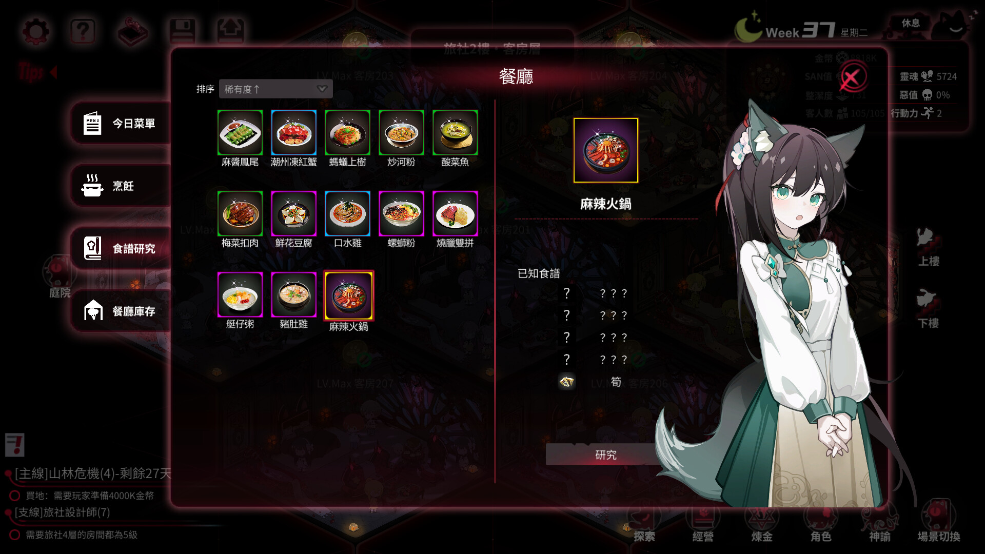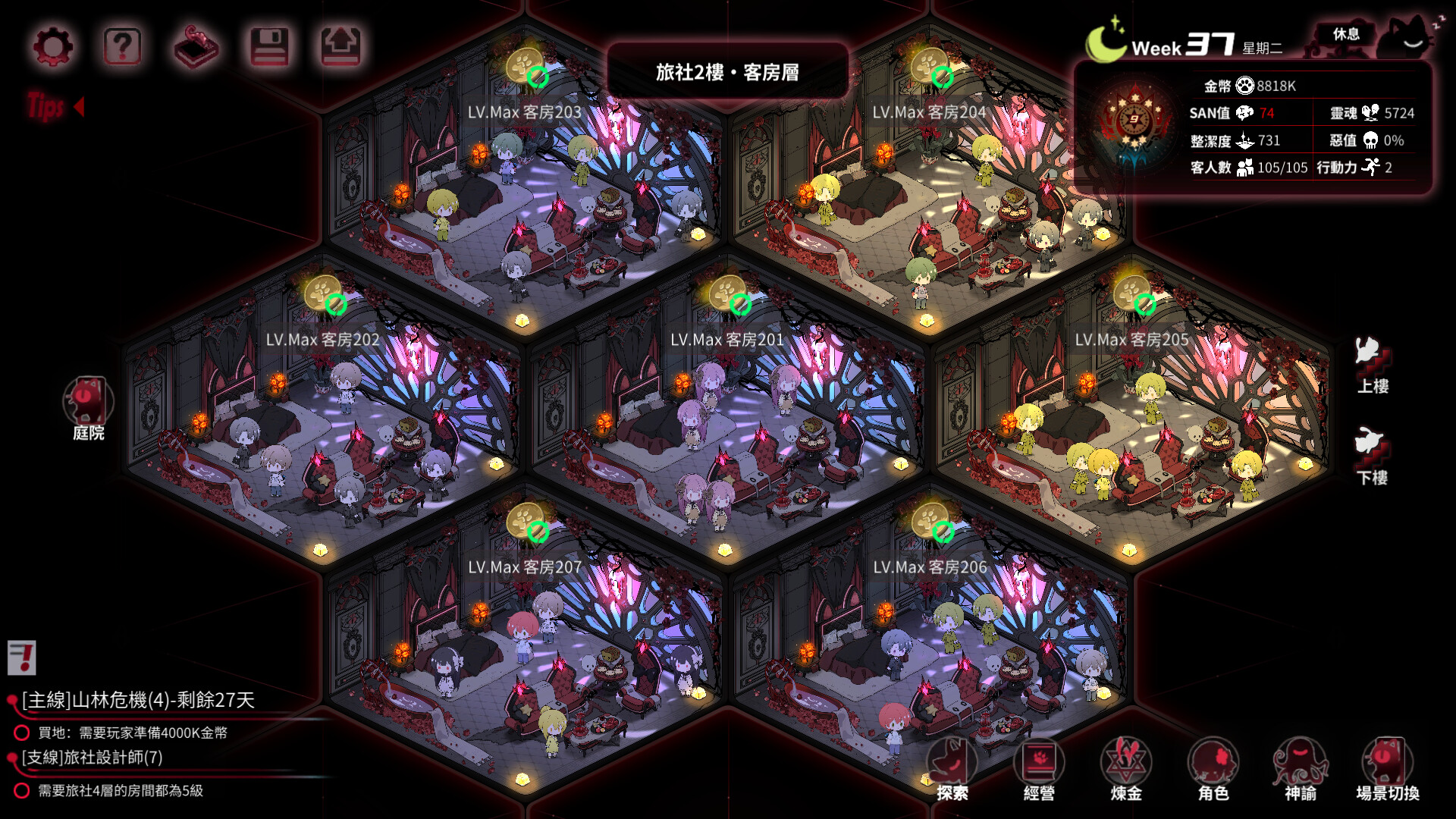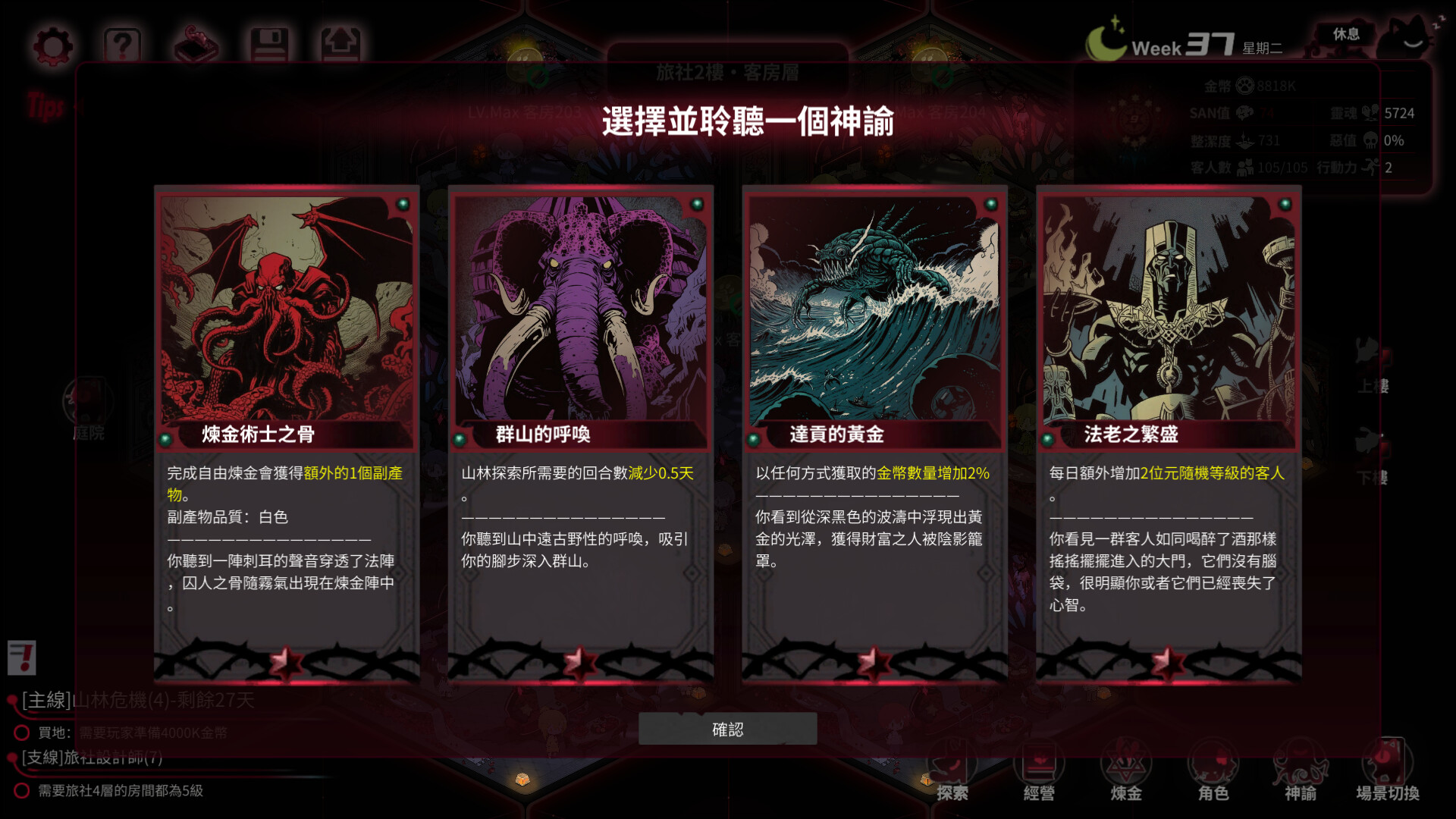 你繼承了一座荒廢已久的別墅並欠下黑暗的債務。你將招募死神、龍族、斬靈師、人造人等員工並開展旅社經營。奇怪的客人們將帶著神秘事件到訪。在遊戲裡,你可以通過挖礦,冒險,煉金,經營餐廳等不同策略積攢資產,並通過神諭系統不斷調整策略(神諭掉SAN,嚴防死守自己作為人類最後的理性!),帶領旅社走向不同結局,而世界也將因你的選擇產生奇怪的蝴蝶效應。另,員工可攻略。目前結局23個。