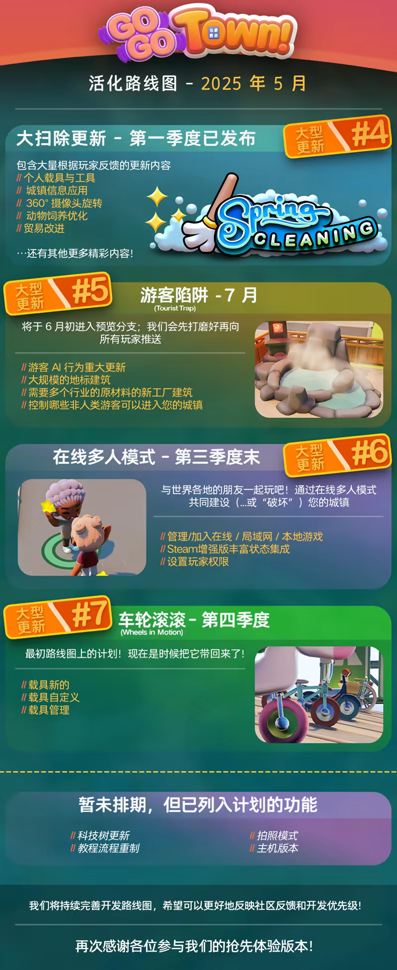 “过去一年里,我们开展了多次Go-Go Town!的试玩测试,并从社区获得了超棒的反馈、建议和评价。本游戏已因此变得更完善,虽然我们为Go-Go Town!设想了一个长期愿景,但我们想继续与我们的社区合作来实现这一愿景。”