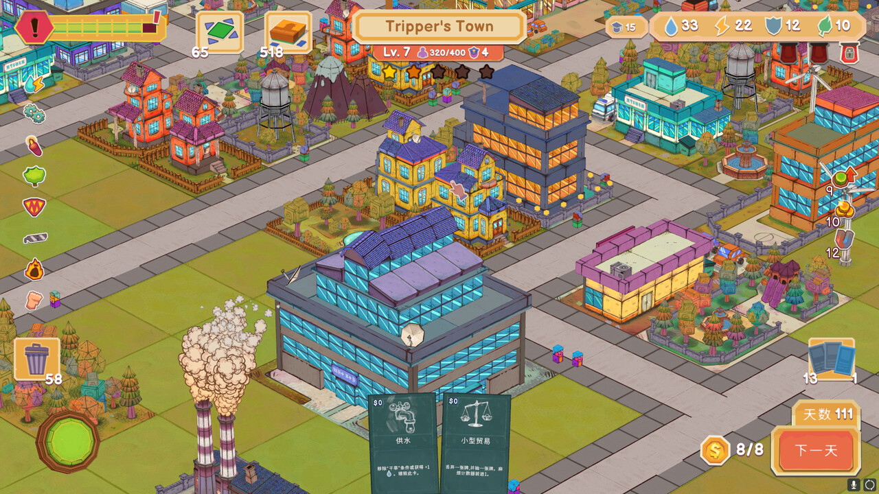 “本作是一款卡牌建造游戏,主要玩法就是拿从固定牌组中随机抽取的卡牌构建你的城镇,卡牌除了建筑,还有抽牌、弃牌、来牌等各种类型的效果牌;每张卡牌都有金币消耗,每个回合的金币跟等级有关;决定城镇成长的关键性因素,就是人口以及资源;游戏中还存在一个灾难系统,会因为每回合和某些卡牌而累积进度条,从而造成负面影响。——模拟经营与roguelike的相得益彰,相比于单纯的建造游戏更有随机性所带来的乐趣。”