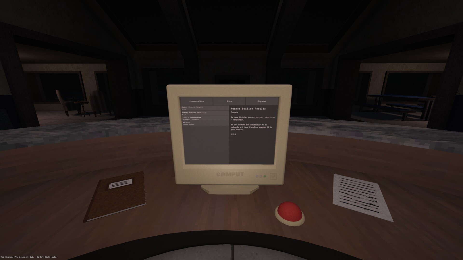 Ships need to be tracked from the command centre. Depending on the type of ship different frequencies of radio need to be used to communicate with the ship. All messages sent to the ships are pre-recorded. Messages sent back are translated on screen. A database of the ship's flags and styles can be found near to the communication desk. Some ships will be friendly and you can decide if you want to let them through. You have to check some elements of the ship, such as the cargo or crew manifest, and accept or turn them away as necessary.