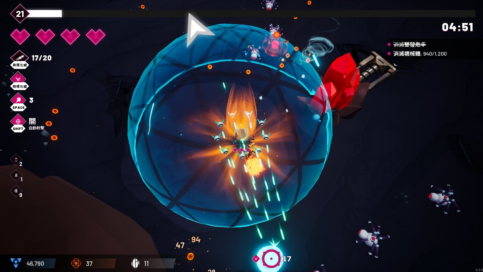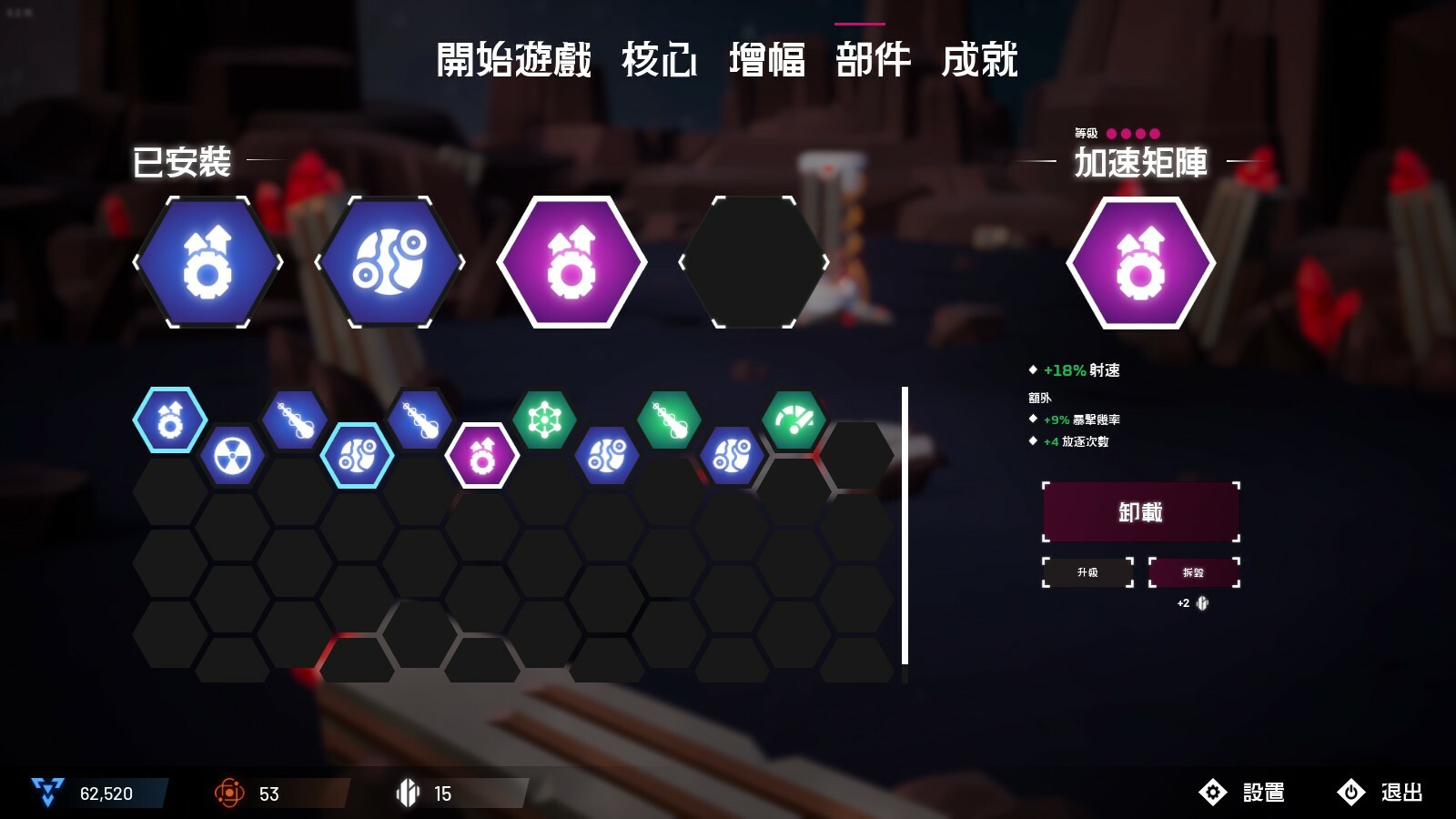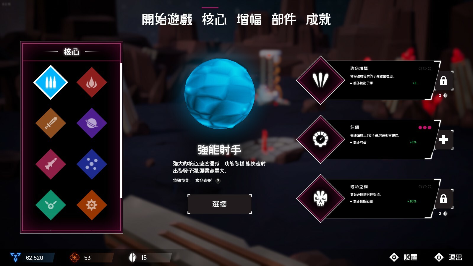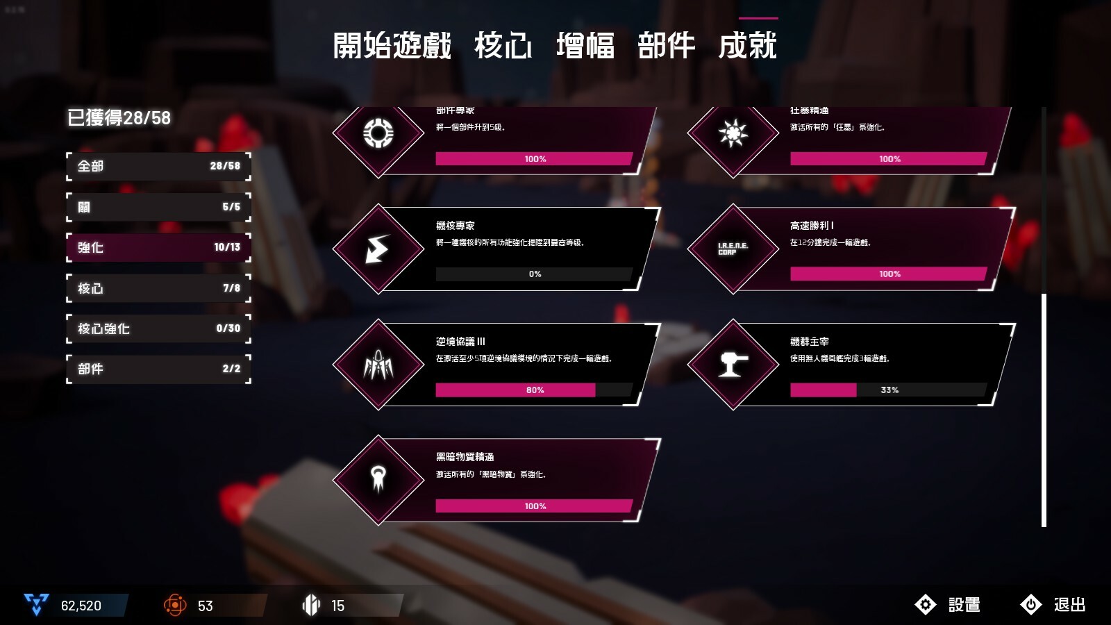 通過探索地圖、擊敗敵人並吸收核心來解鎖成就並獲取資源,從而製作更多的武器與裝置。也不要忘記升級它們,以發揮出更加強大的力量。