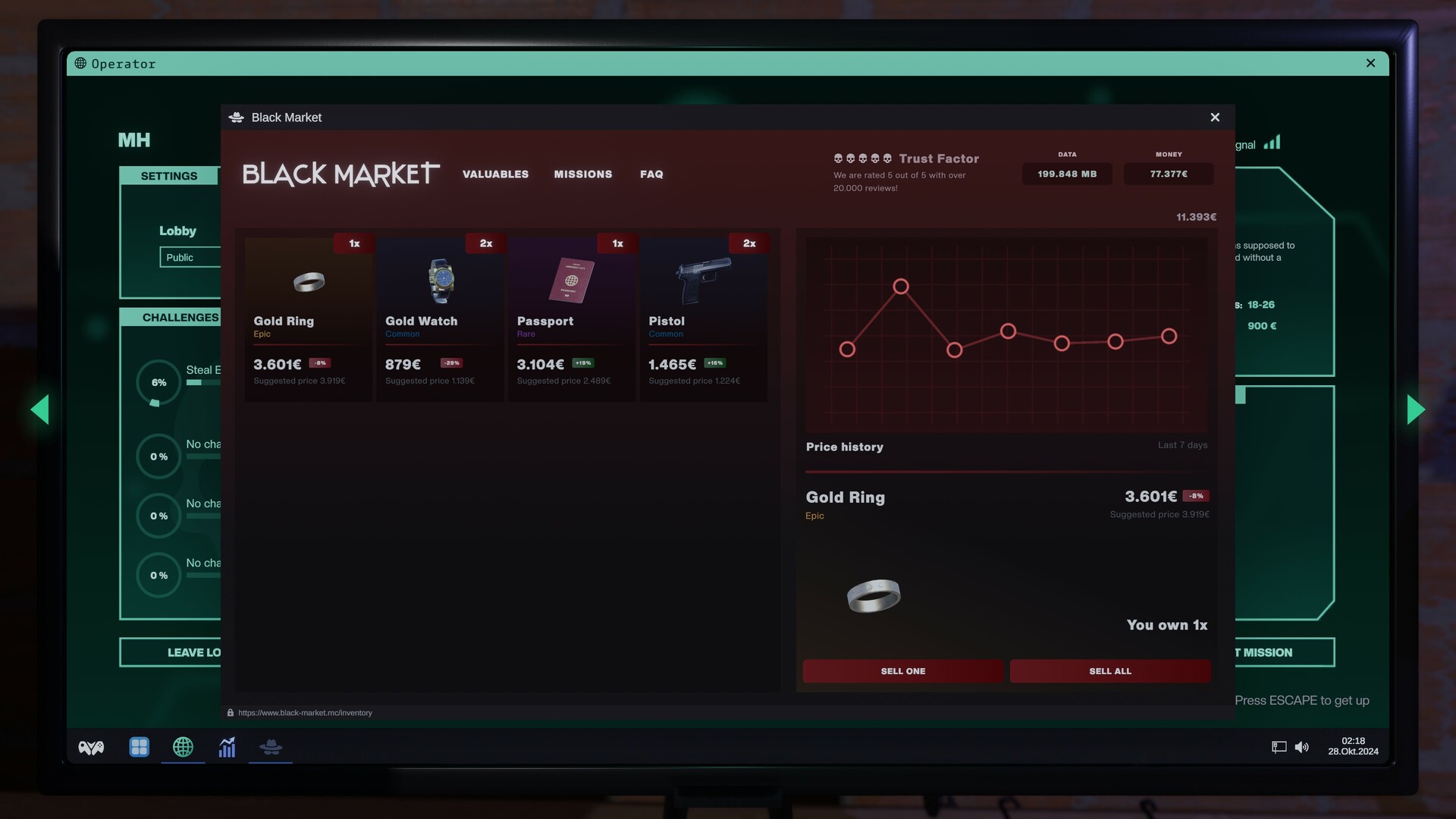 Na Černém trhu můžeš prodávat vysoce cennou kořist, jejíž cena se každý den mění, a přistupovat k misím z černého trhu. Tyto speciální mise ti umožňují dramaticky manipulovat tvé loupeže, abys maximalizoval svou kořist výměnou za těžší výzvy.