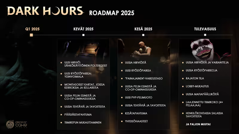 • Tutki: Etsi alueelta ulospääsyä, ratkaise yhteistyössä pelattavia minipelejä, sammuta lasereita ja turvakameroita, täytä reppusi arvokkailla saaliilla ja hyödynnä rakennuksen salaisuuksia päästäksesi sieltä pois. Ryöstöt eivät ole koskaan samanlaisia Dark Hoursin proseduraalisesti luoduissa ympäristöissä. Älä eksy!