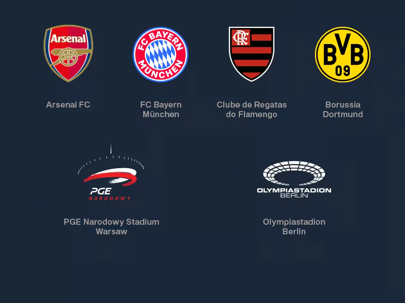 Seis clubes legendarios. Entre ellos: Borussia Dortmund, FC Bayern München, Arsenal FC, CR Flamengo, Beşiktaş JK y uno más que aún está por revelarse; cada uno aporta su propia filosofía, cultura de aficionados y expectativas.