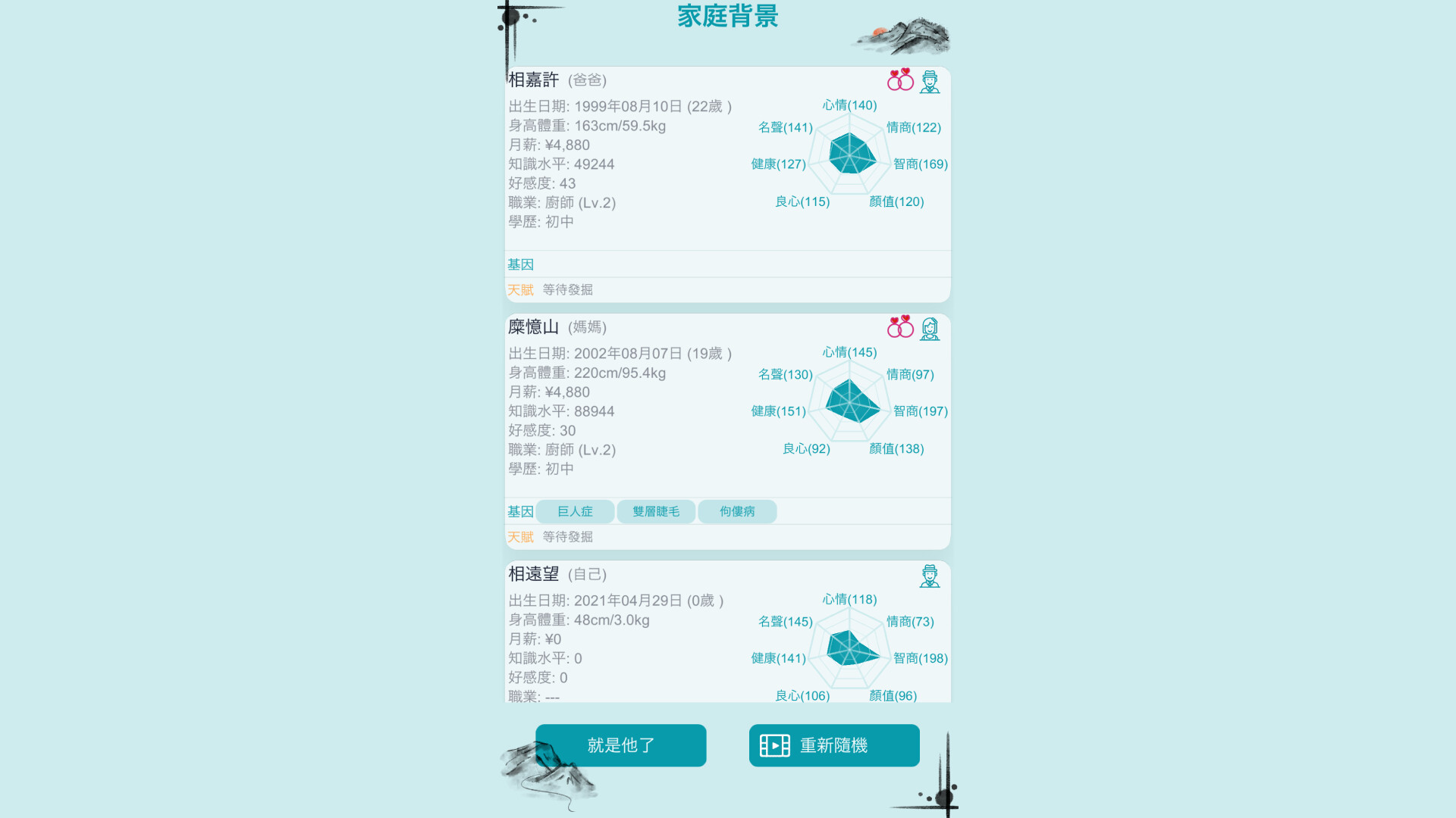 你的身份、你的基因、你的天賦都是隨機的; 你的父母、兄弟姐妹也都是未知的!