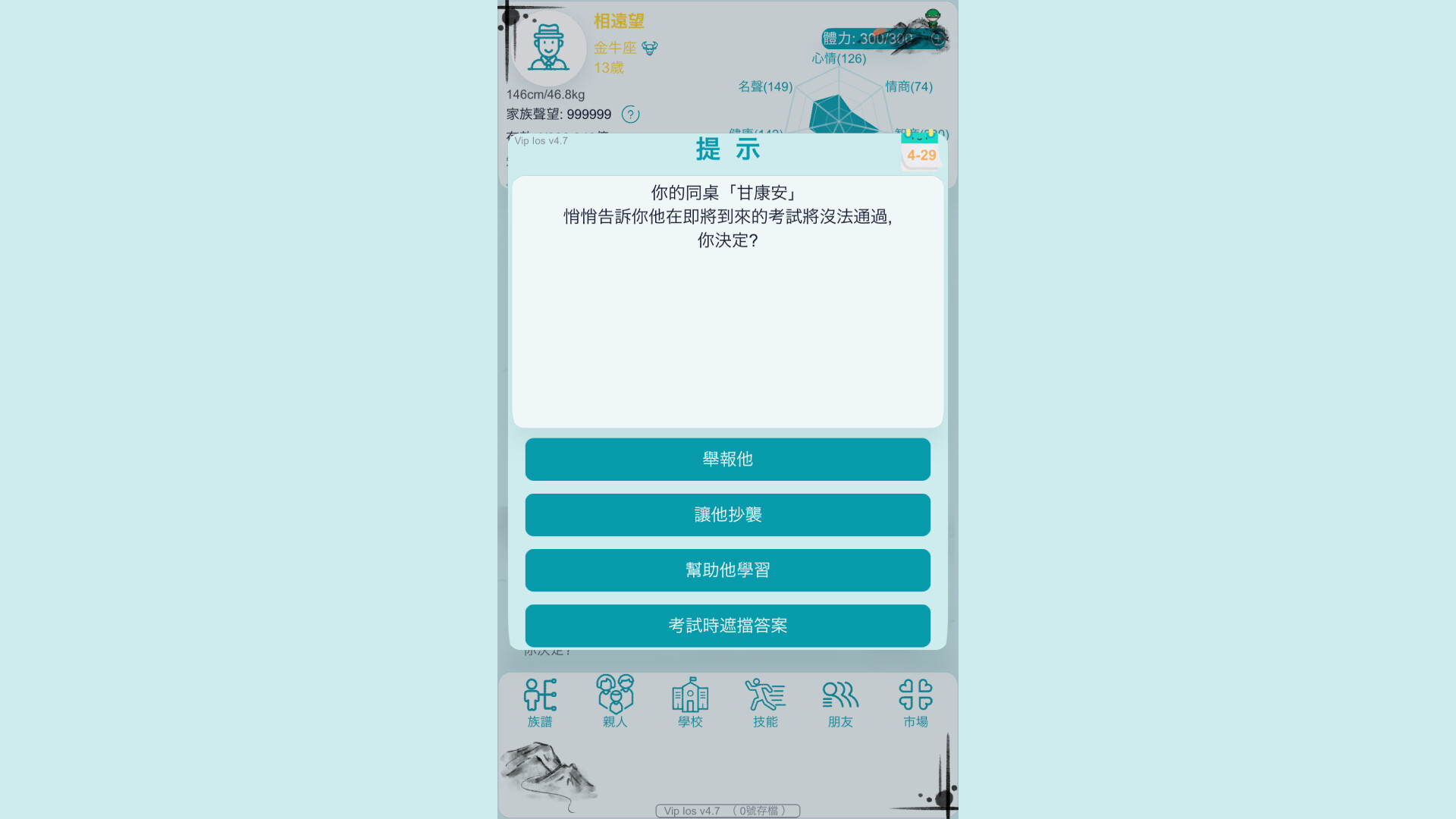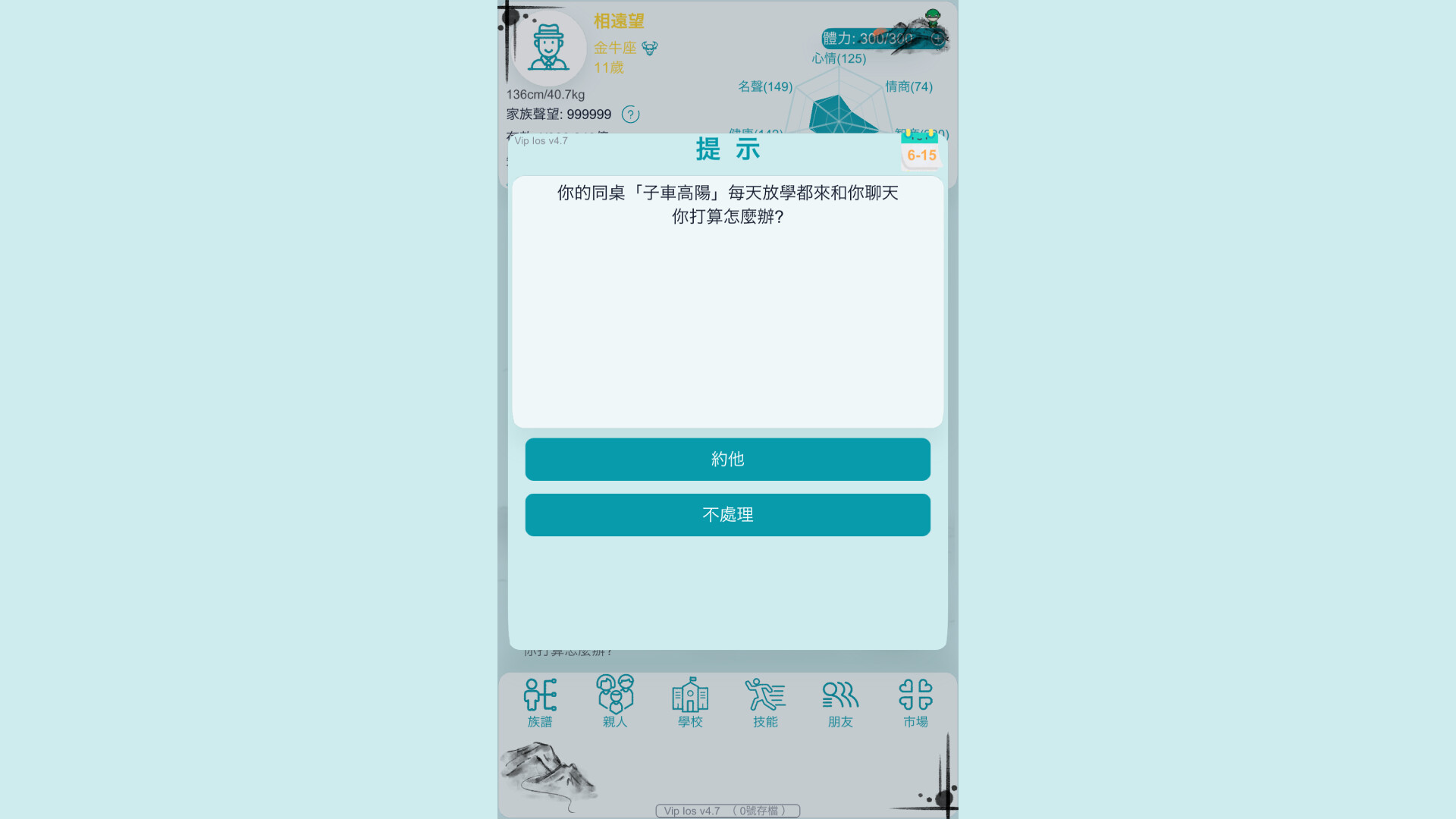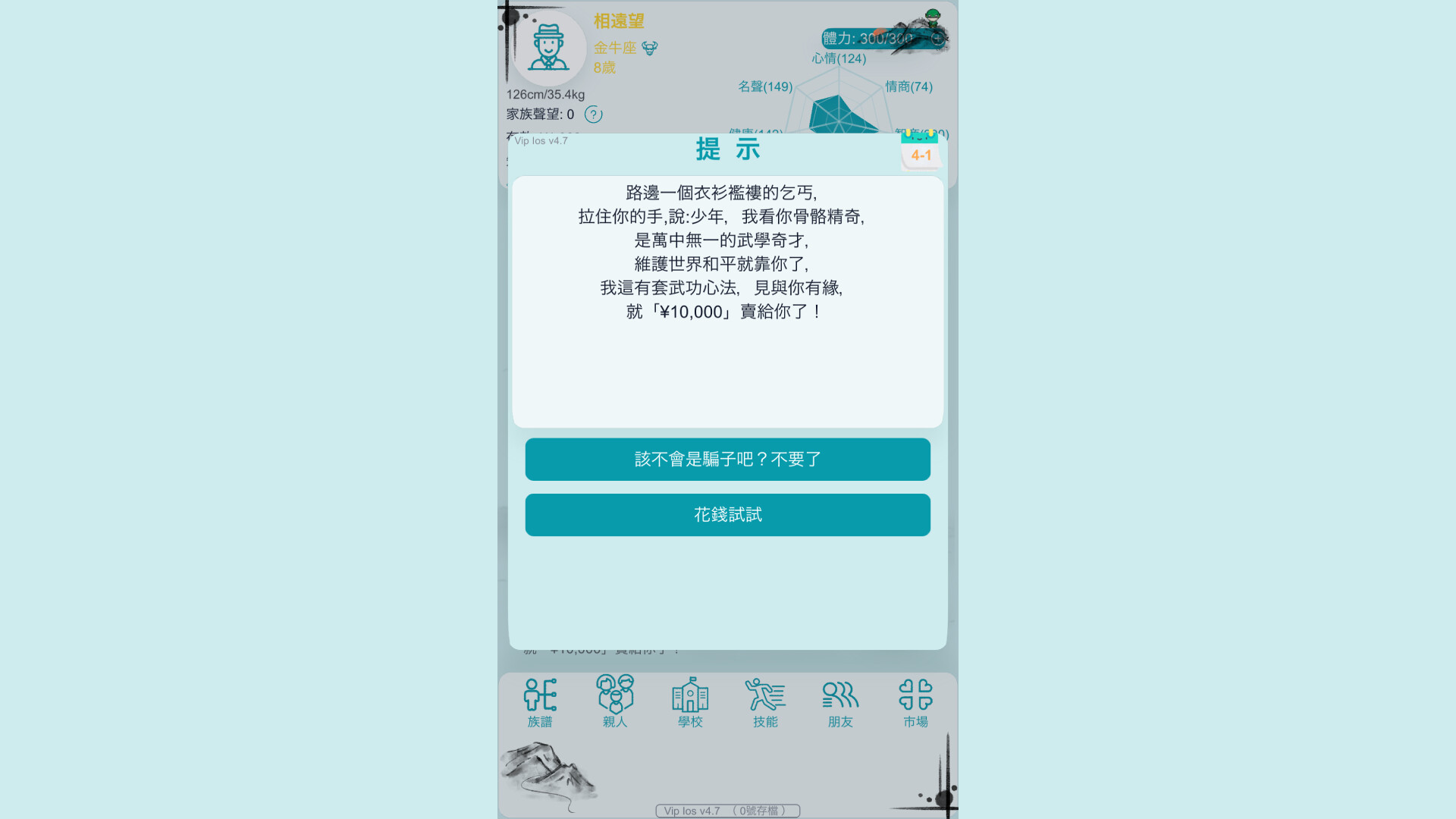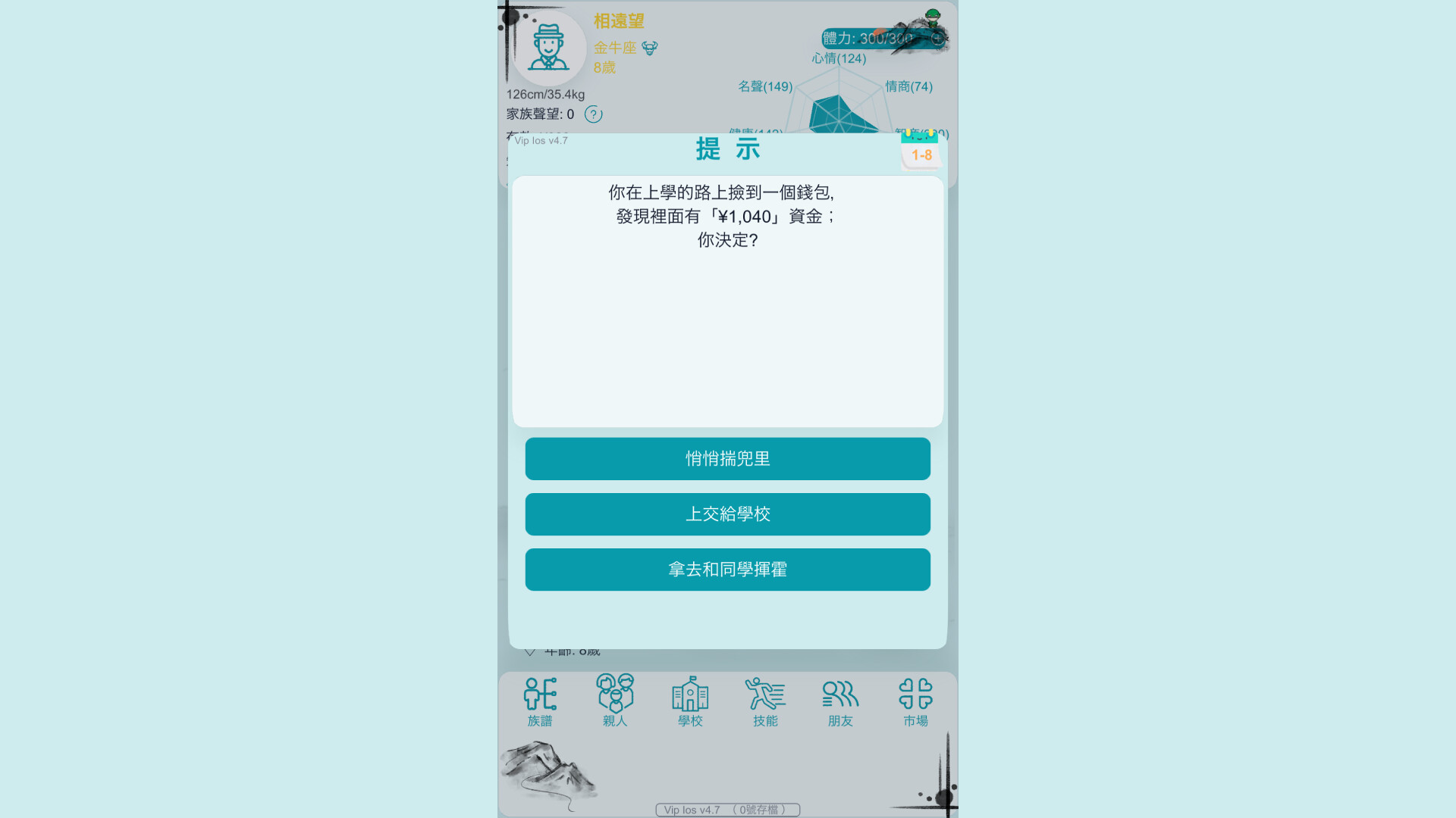 一款以類比現實生活中你敢想卻不敢做的“人生遊戲”! 在這裡你可以按照你的想法: 去開啟新的人生! 去創造你的家族! 遊戲提供各種功能,如族譜系統、賭博、研究院、房地產、股票市場、寵物系統、繼承系統、出軌、同志、監獄等等。 等等等等…. 只有你想不到,沒有開發者做不到的!