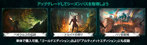 シーズンパスは、アサシン クリード ヴァルハラの「ゴールドエディション」および「アルティメットエディション」にも収録されています。