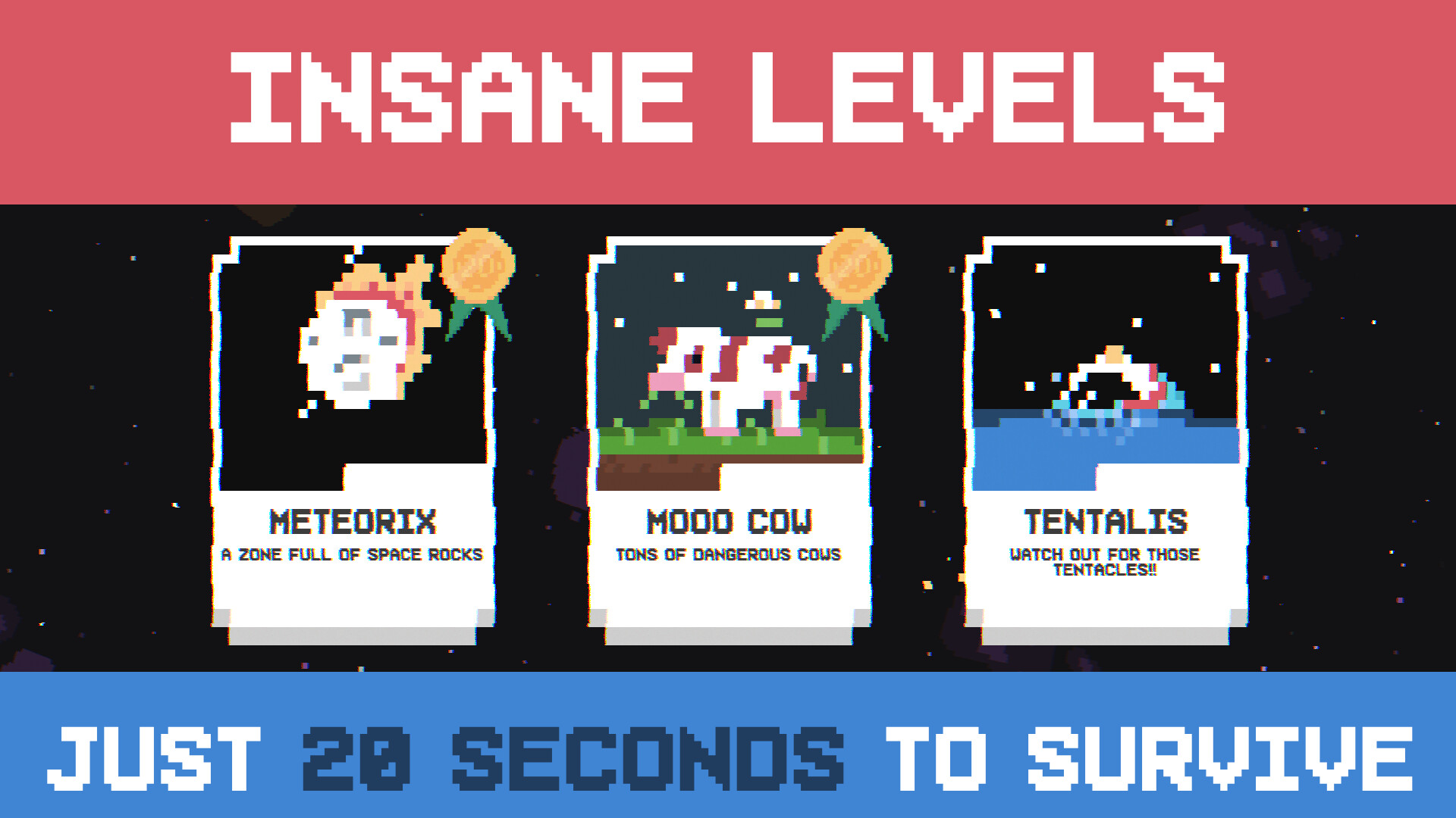 In My Last 20’s Missions, you’ll face 20 seconds of pure arcade madness. Asteroids? Cows? Tentacles? Each chaos zone is different with it's own difficulty and only the fastest astronauts will make it out alive.