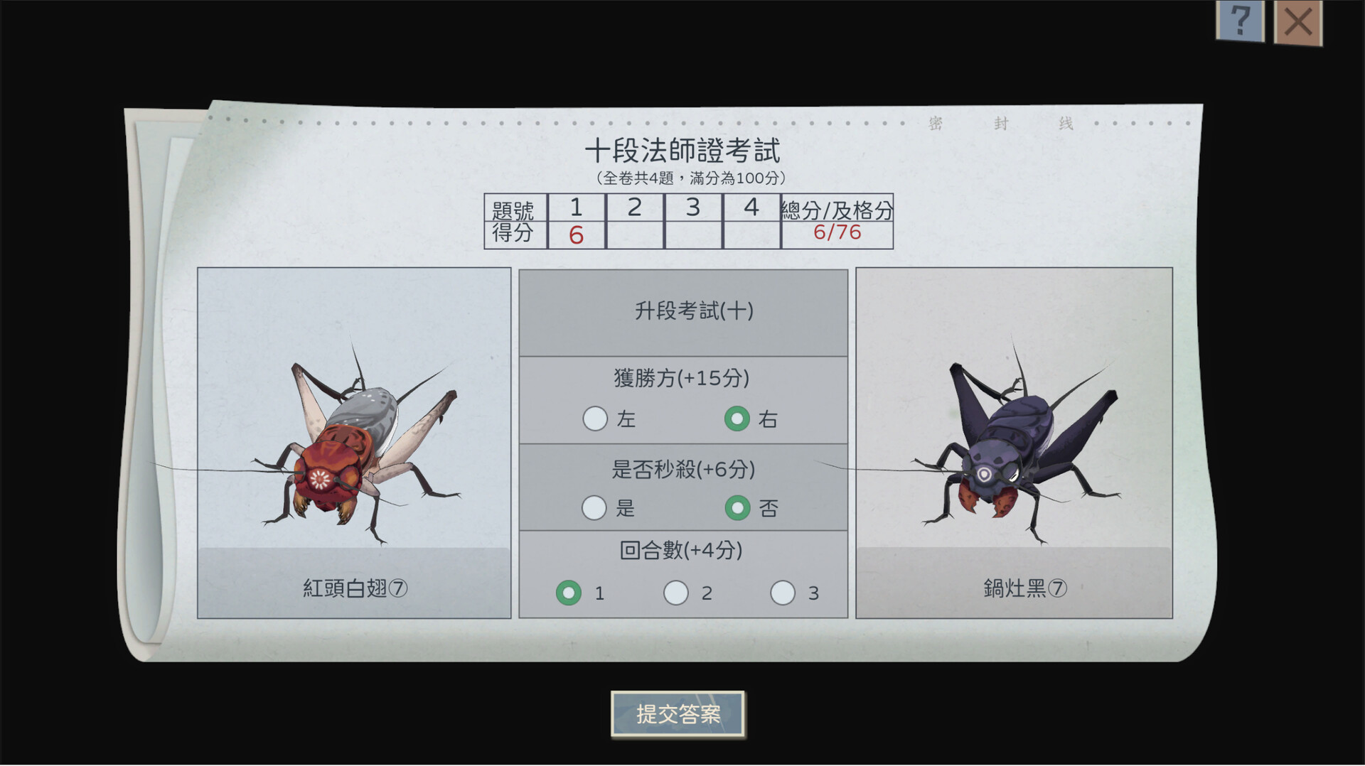 沒有兩只屬性相同的蟋蟀,也沒有兩只長相一致的蟋蟀。有些蟋蟀觸鬚斷了一截,有些兩條尾巴都禿了,有些甚至少了一條大腿……遊戲不會直接告訴你蟋蟀屬性的具體數值,但會指明大致的範圍並提供對比。另外,你可以通過360度旋轉來觀察蟋蟀,根據其長相和數值面板來估算它的強弱,比如翅膀越長鬥性越強......