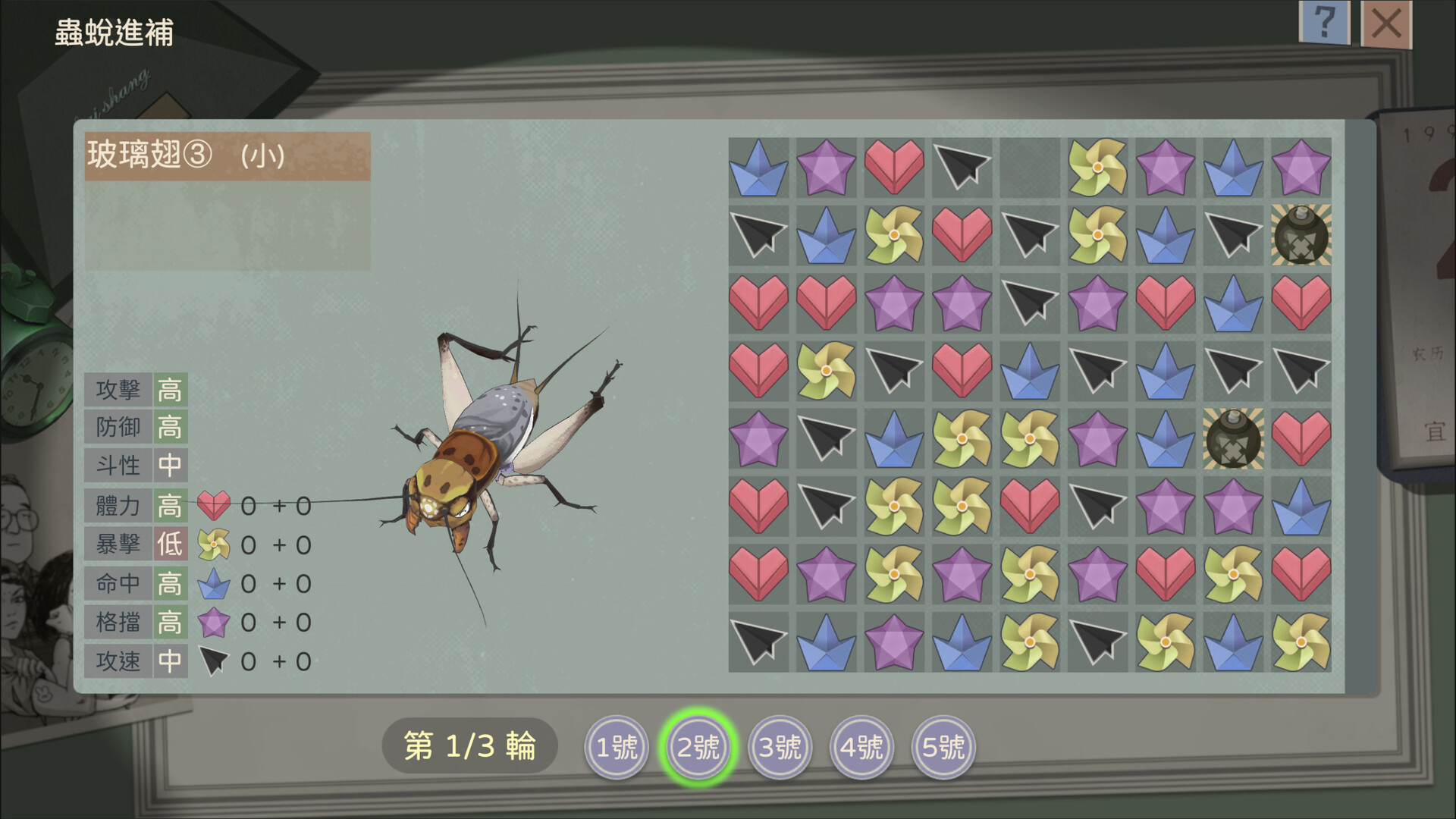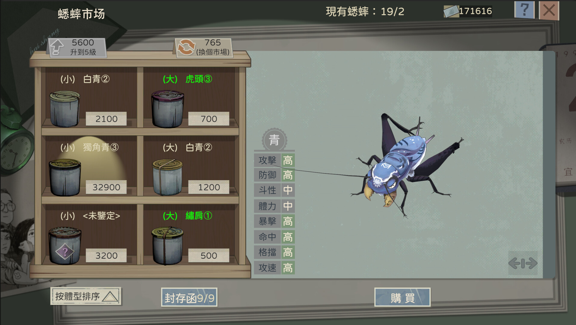 沒有兩只屬性相同的蟋蟀,也沒有兩只長相一致的蟋蟀。有些蟋蟀觸鬚斷了一截,有些兩條尾巴都禿了,有些甚至少了一條大腿……遊戲不會直接告訴你蟋蟀屬性的具體數值,但會指明大致的範圍並提供對比。另外,你可以通過360度旋轉來觀察蟋蟀,根據其長相和數值面板來估算它的強弱,比如翅膀越長鬥性越強......