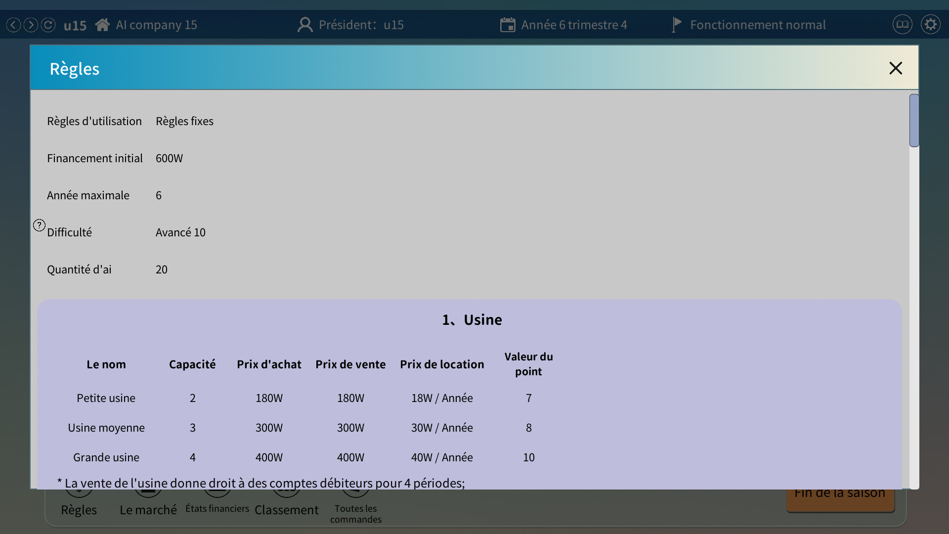 Il y a ai dans le jeu pour rivaliser avec vous sur le marché.Avec 11 niveaux de difficulté, à mesure que la difficulté augmente, le marché sera de plus en plus concurrentiel, la capacité budgétaire de l'IA deviendra de plus en plus forte, la capacité budgétaire de l'IA de la dernière difficulté deviendra très forte et vos capacités augmenteront lentement dans le processus de concurrence avec l'IA.