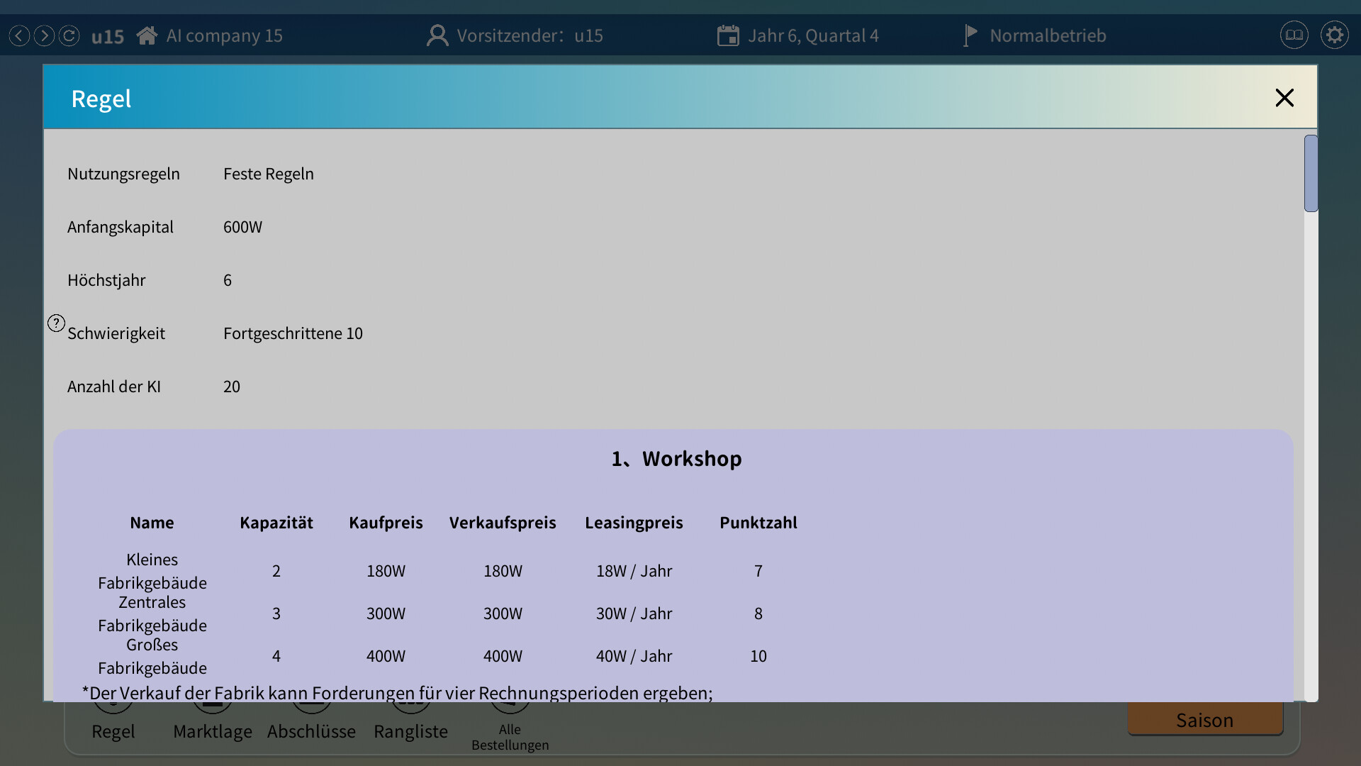 2. Es gibt KI im Spiel, die mit Ihnen auf dem Markt konkurriert.Mit 11 Schwierigkeitsstufen wird der Wettbewerb auf dem Markt immer intensiver, die Budgetfähigkeit der KI wird immer stärker, die Budgetfähigkeit der KI auf dem letzten Schwierigkeitsstufe wird sehr stark und Ihre Fähigkeiten werden sich langsam im Wettbewerb mit der KI verbessern.