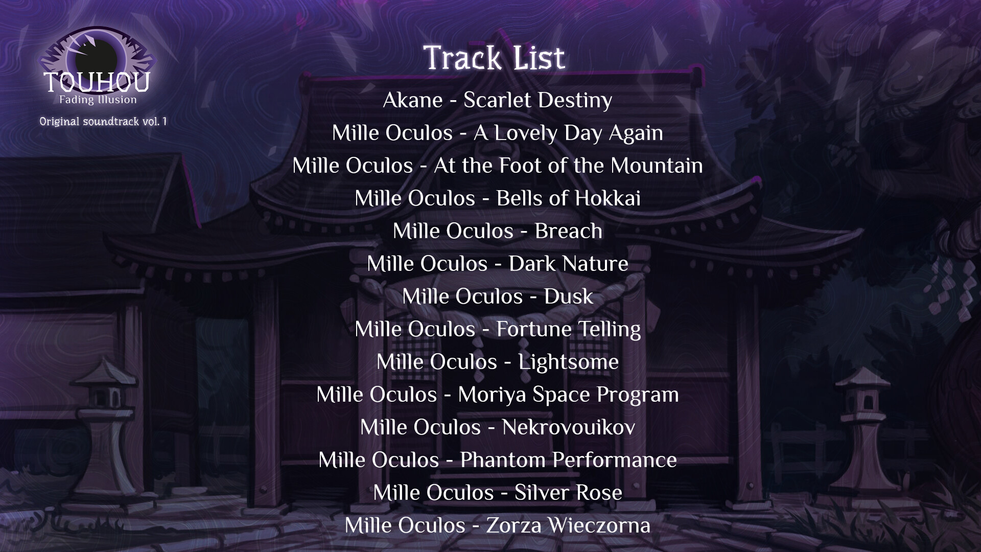 This is the first part of the Touhou: Fading Illusion soundtrack. Here are 13 tracks by Mille Oculos and the title theme by Akane.