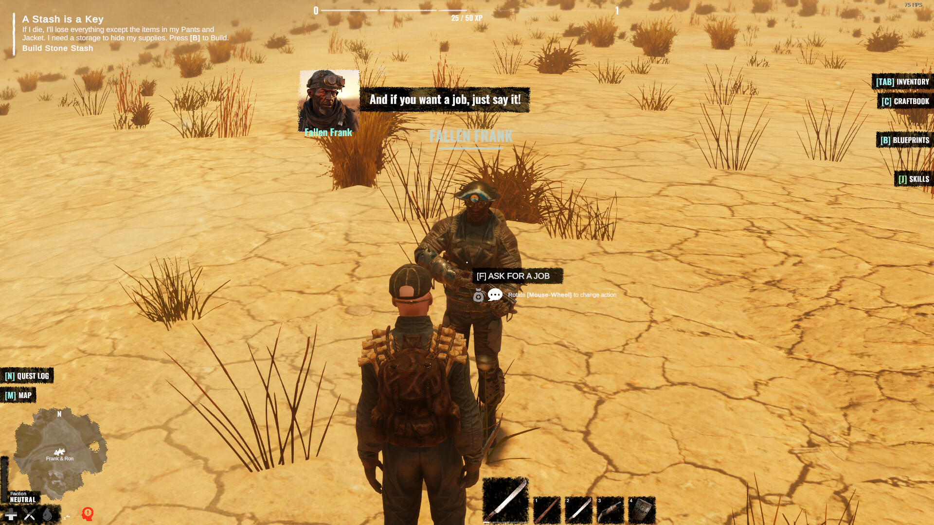 You start out as a neutral survivor, and your only mission is to survive. How? That's up to you. You can build loyalty to one of the two factions, or you can stay neutral. There are advantages and disadvantages to both. Find out who's on the side of good and who's on the side of evil. Explore the world. Build your sanctuary. Trade. But above all, survive!