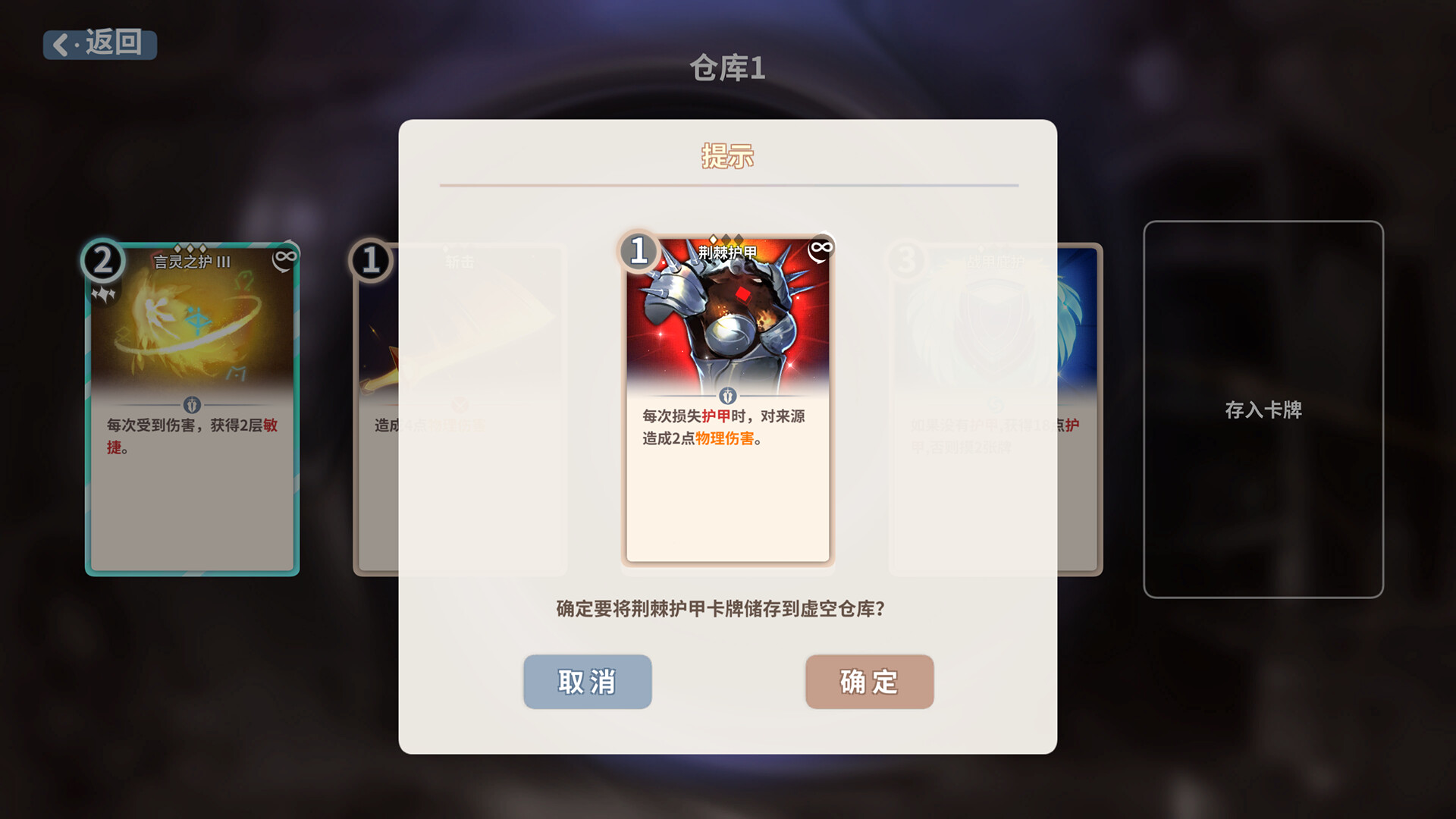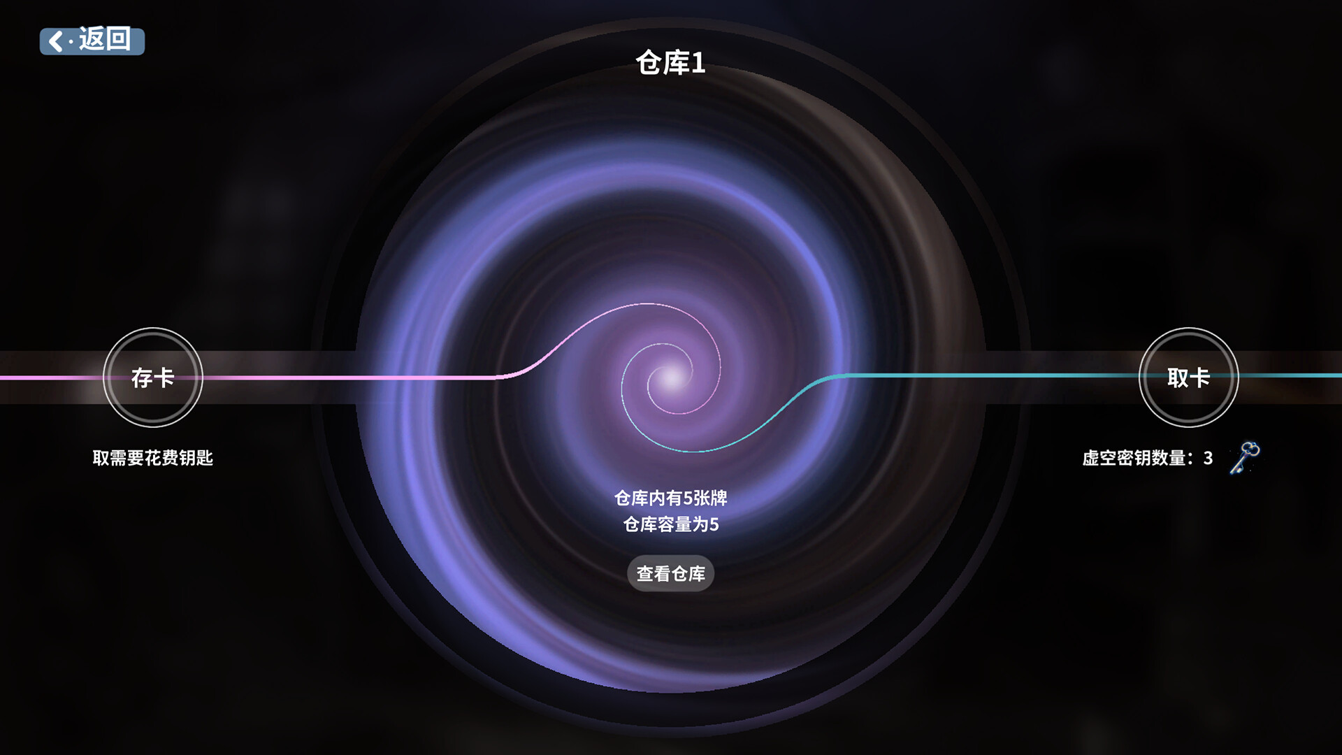 “虚空仓库”为游戏《克瑞因的纷争》中针对卡牌构筑的一种游戏形式,可在当局游戏中存放已构筑好的卡牌,开启新周目后,可于虚空仓库中取出之前保存好的卡牌套组进行使用。