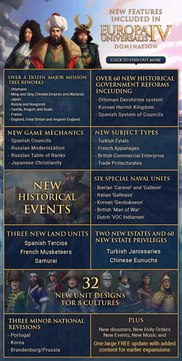 Three new types of Land special units - 'Samurai' for Japan, 'Tercios for Spain, and 'Musketeers' for France, and a new feature of Naval special units, with 6 special units for Portugal, Spain, Great Britain, Korea, Netherlands, and Genoa and Venice.