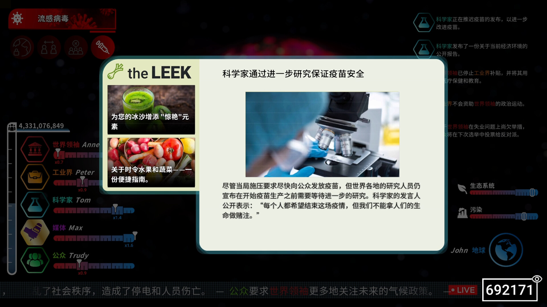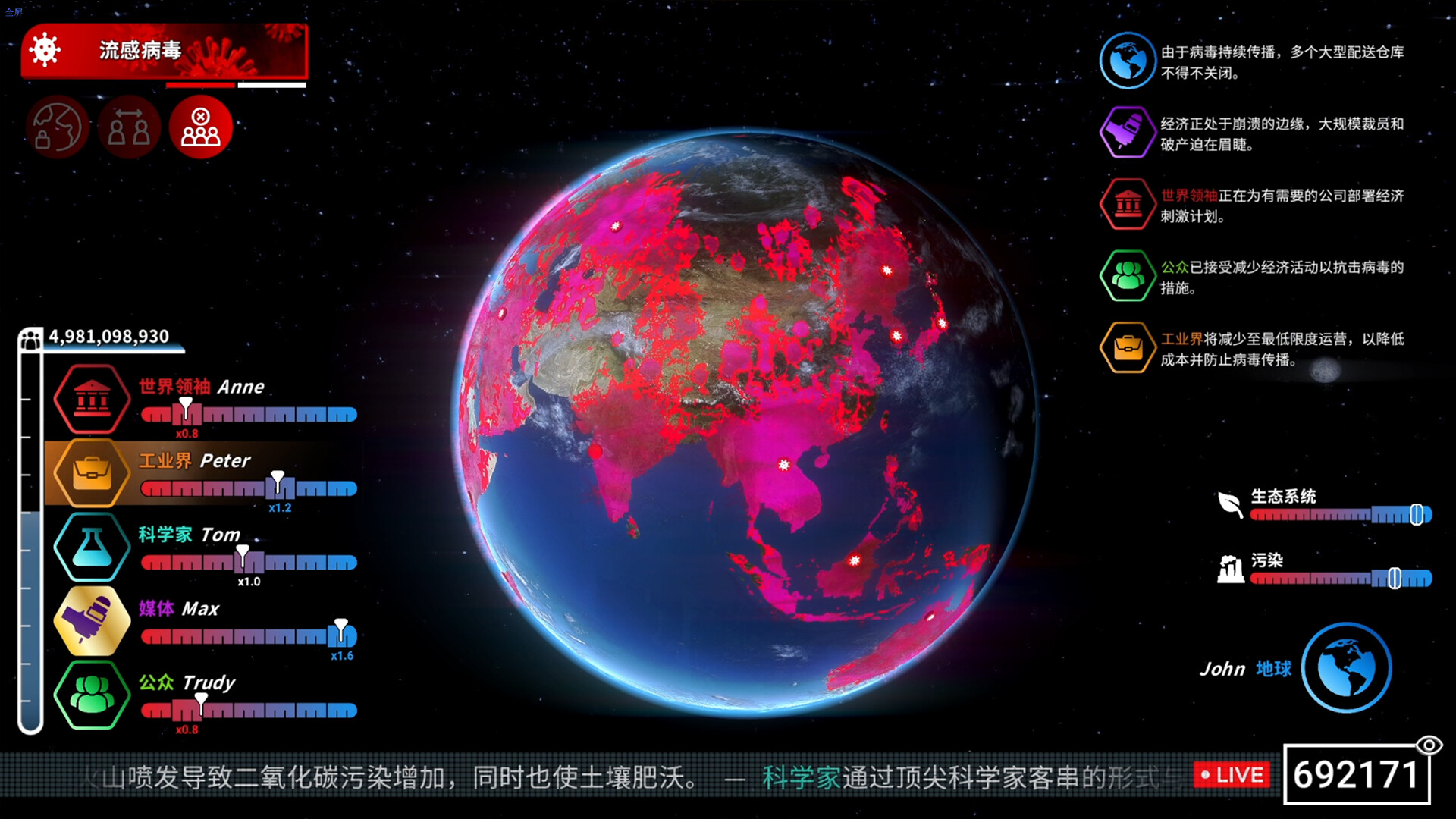作为媒体的代表,你是让普通人见证到世界真相的唯一途径,你需要使用自己的点数进行报道,将灾难来到的影响降到最低,你甚至还可以将其他人的决策颠倒黑白反转乾坤。但你可能要面对恼羞成怒的世界领袖,自私贪婪的工业界,毫无人道的科学家和不愿相信一切的公众
