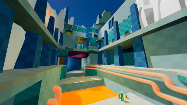 Start your Jump Dash Soar journey in the expansive and intricate Sludge Factory. Learn the basics of dashing, rocket jumping, and slope jumping, and use those skills to reach 48 total collectibles! Some are relatively easy to reach, but others will test all the skills you've learned.