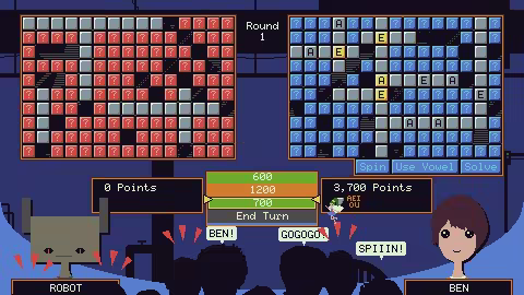 Search your board for blank letter tiles, vowels, points, and other goodies. When you think you've revealed enough blank tiles to form a few words, start spinning to pick letters, and rack up points!