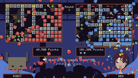 Part crossword, part battleship, part game show. Word x Word pits two contestants against one another in a battle of word-hunting wits! Whoever earns the most points across three rounds wins the game.