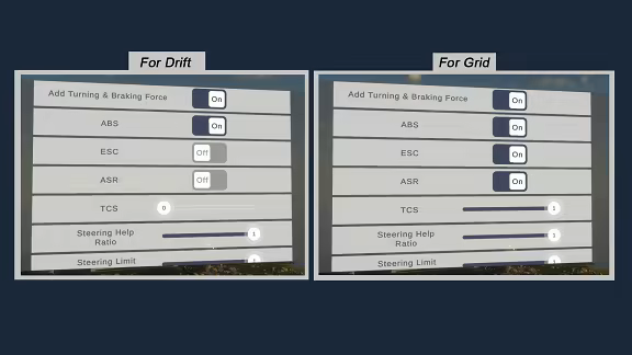 You can adjust your car's driving support systems in Difficulty Setting. In this way, you can make your car either drift or handling.