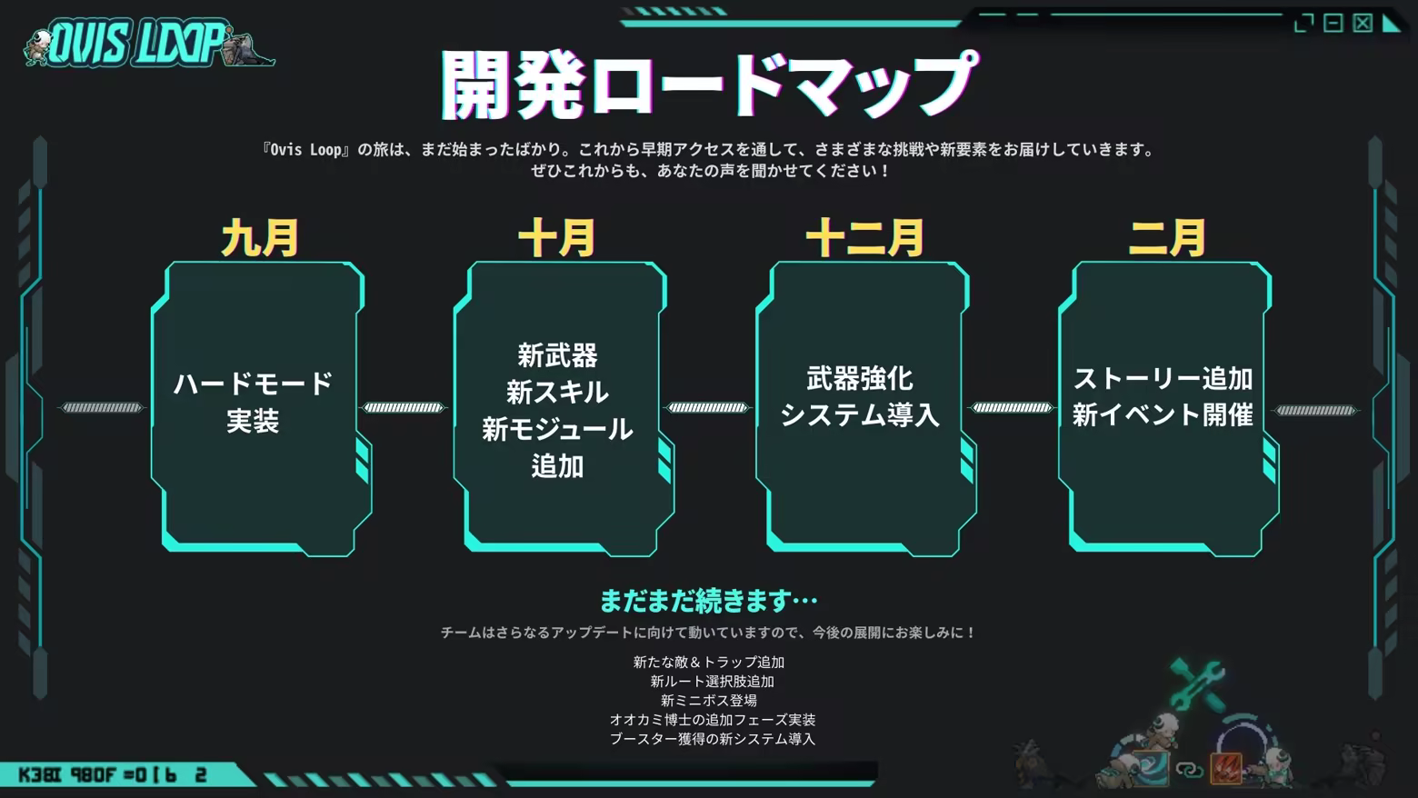 “OVIS LOOPの継続的な早期アクセス期間中、私たちはフィードバックを積極的に取り入れたいと考えています。公式Discordサーバー(ゲーム内リンクあり)にフィードバックを残すことや、Steamフォーラムで議論することができます。また、他のソーシャルプラットフォーム上でもフィードバックを監視します。プレイヤーコミュニティの意見に基づき、多くの変更や改善を行う予定です。”