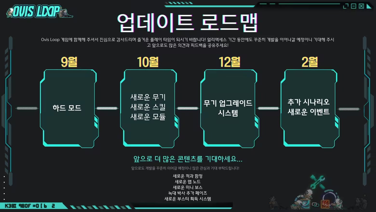 “OVIS LOOP는 지속적인 앞서 해보기 과정에서, 저희는 피드백을 적극적으로 수용하고 싶습니다. 저희 공식 Discord 서버(게임에 링크됨)에 피드백을 남기거나 Steam 포럼에서 토론할 수 있습니다. 저희는 또한 다른 소셜 플랫폼에서 피드백을 모니터링할 것입니다. 저희는 플레이어 커뮤니티 피드백을 기반으로 많은 변경 및 개선을 진행할 계획입니다.”