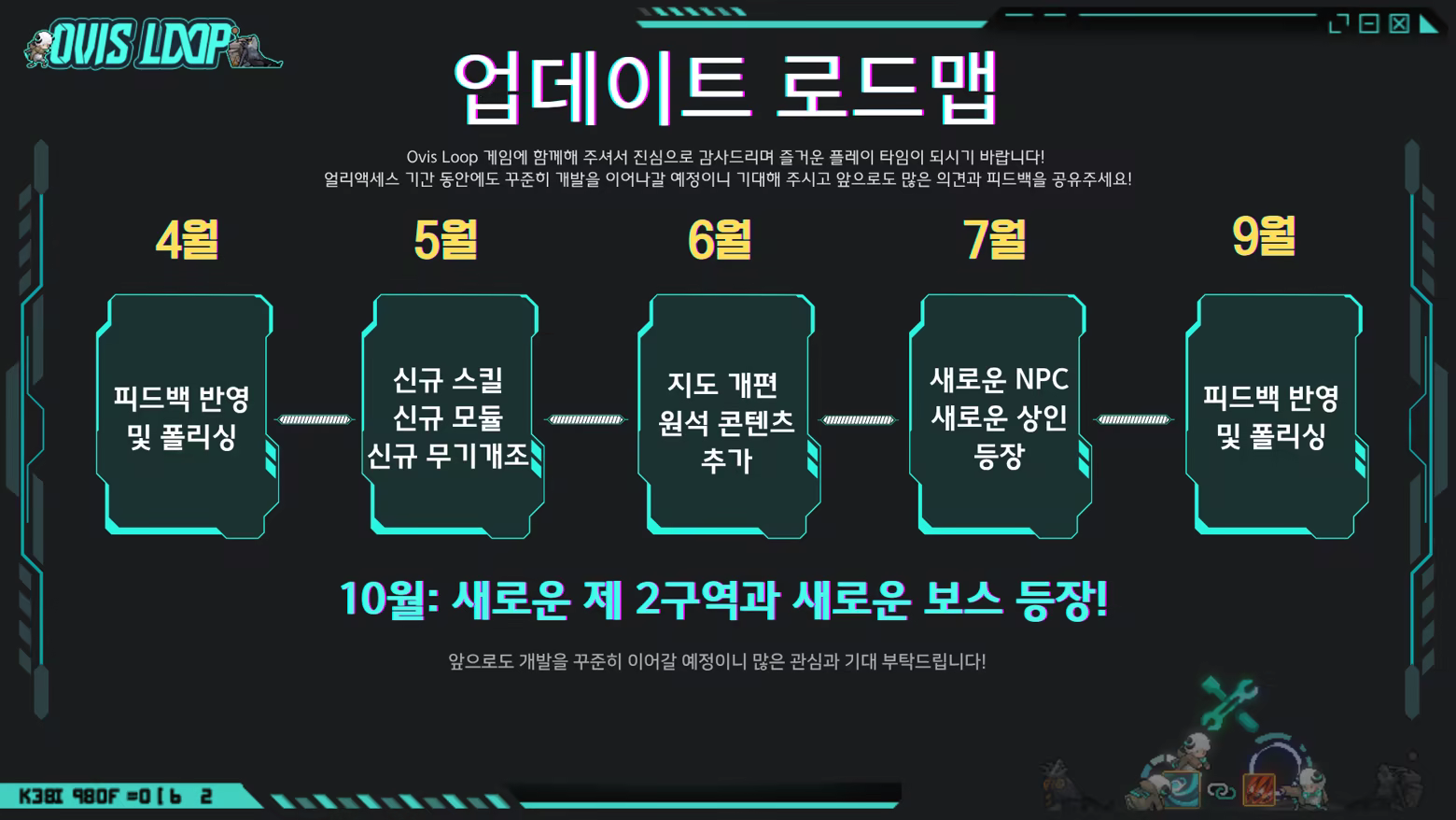 “OVIS LOOP는 지속적인 앞서 해보기 과정에서, 저희는 피드백을 적극적으로 수용하고 싶습니다. 저희 공식 Discord 서버(게임에 링크됨)에 피드백을 남기거나 Steam 포럼에서 토론할 수 있습니다. 저희는 또한 다른 소셜 플랫폼에서 피드백을 모니터링할 것입니다. 저희는 플레이어 커뮤니티 피드백을 기반으로 많은 변경 및 개선을 진행할 계획입니다.”