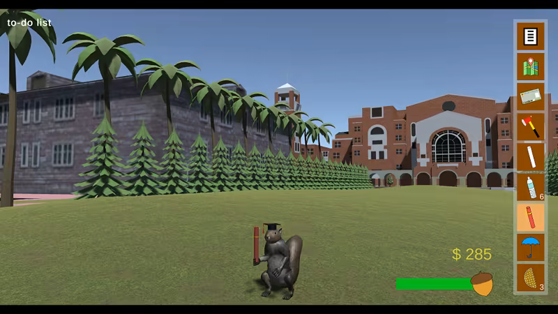 You are a squirrel, the goal is to get a diploma on campus, it is that simple. You can follow the to-do list to play, or find secrets in every corner of the campus, but most of the buildings are just decoration.