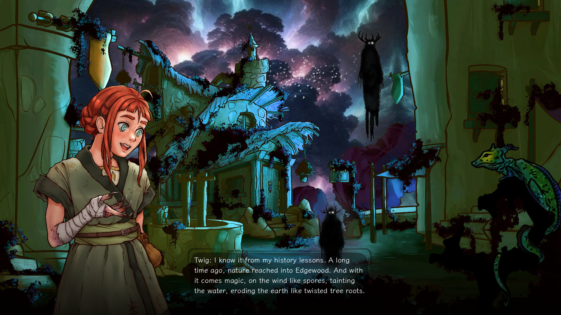 When you're not foraging, resting or spending time in the alchemy lab, you travel the countryside of a land torn apart by wild magic. By your side: two trusty familiars — the cunning and loyal Lizard, as well as the wise and supportive Goat.