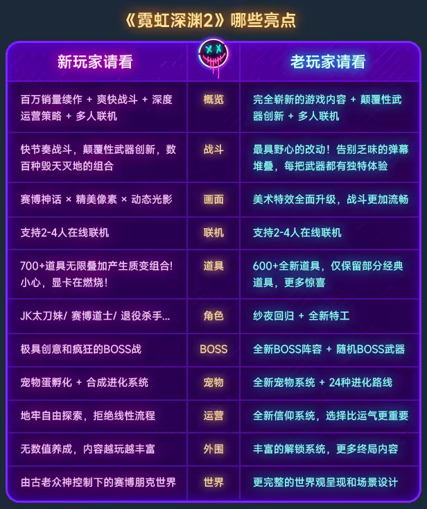 “抢先体验中的《霓虹深渊2》已经拥有比初代《霓虹深渊》更多的层级、敌人、角色和首领,并支持多人联机,还包含所有初代的敌人和首领。但即便如此,游戏依旧尚未开发完整,仍有很多特殊房间、角色、敌人、武器、首领和系统正在开发中,并且联机体验可能还有很多优化空间。我们已经积极开发了这款游戏三年多。我们希望《霓虹深渊2》抢先体验版本的开发进度能让大多数玩家获得良好体验,同时保留足够空间,以便我们根据收到的反馈进行调整和改进。”