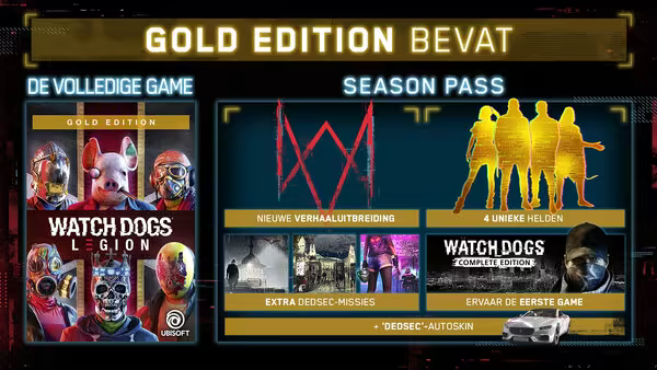 Bij de Gold Edition krijg je de Season Pass, bestaande uit een uitbreiding met twee afleveringen, extra missies, vier helden en de oorspronkelijke Watch Dogs Complete Edition!