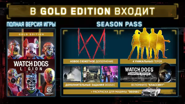 В Gold Edition входит Season Pass: дополнение с 2 эпизодами, бонусные задания, 4 героя и издание Watch Dogs Complete Edition.