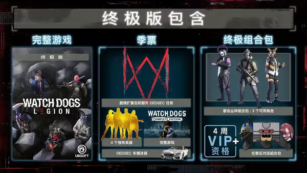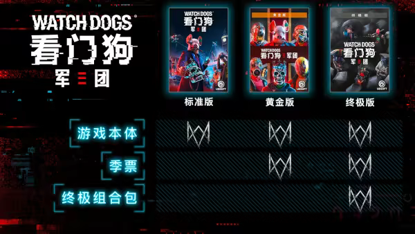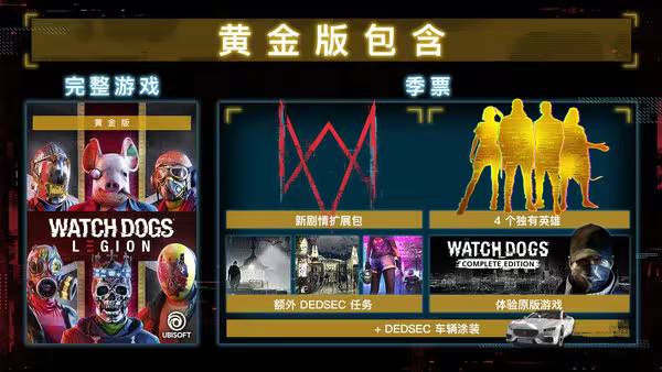 黄金版内含季票,其中包括:覆盖两个章节的大型扩展包、额外的任务、四个英雄,以及初代《看门狗》完整版!