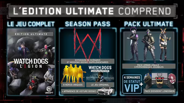L'Édition Gold comprend le Season Pass,qui inclut une extension majeure de deux épisodes, des missions bonus, quatre héros et l'Édition Complète du premier opus de Watch Dogs !