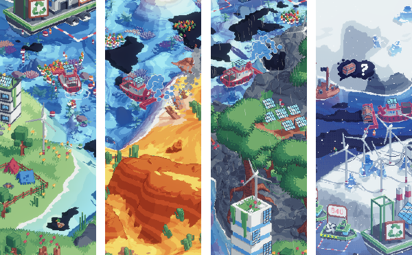 Each area has a new challenge! Push plastic to the recycling centre, wash oil off of the land and more!