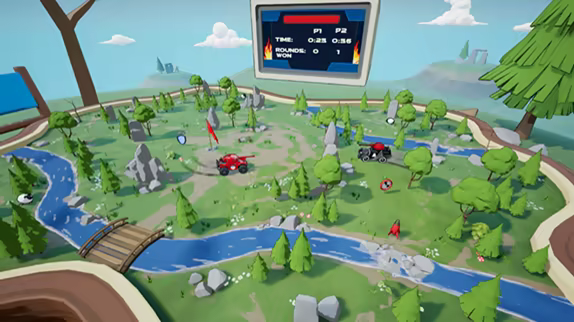 In Multiplayer challenge players in online PvP or split screen couch. Show off your abilities and your tank whilst ranking up to reach the Hall of Fame. Play in arenas across any of the wide variety of lands at day or night. Responsive controls and arcade style handling for performing jumps, stunts and skilled driving.