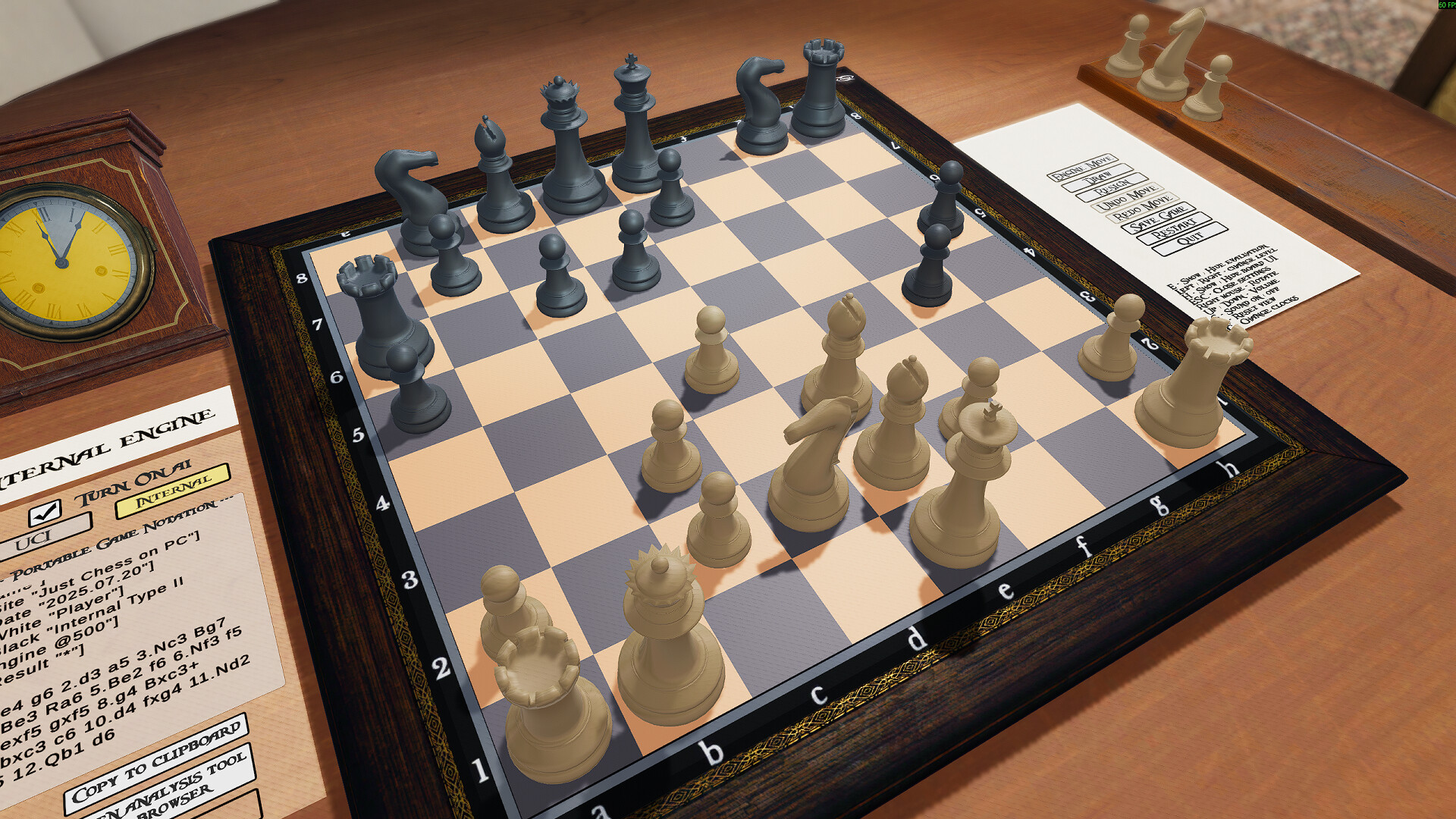 Enjoy a pure and distraction-free chess experience with Just Chess! Whether you're a beginner or a seasoned player, play in a modern 3D setting with powerful UCI engine support and seamless Lichess integration.