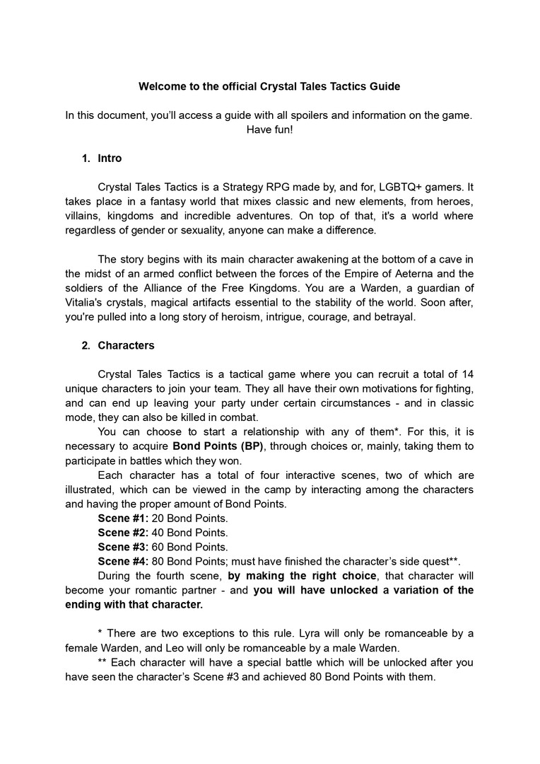 Crystal Tales Tactics Guide is a spoiler document with everything you need to know to complete the game (including all endings). It's the easiest way for you to unlock the whole content of the game (including Steam Achievements).