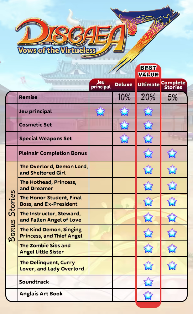 Comprend 3 article(s) : Disgaea 7: Vows of the Virtueless, Disgaea 7: Vows of the Virtueless - Cosmetic Set, Disgaea 7: Vows of the Virtueless - Special Weapon SetRéduirePlus